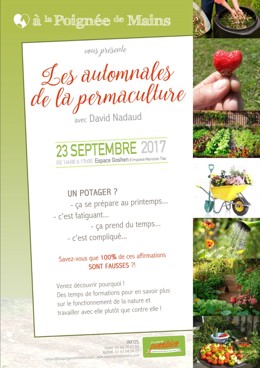 Dans le cadre de la ”Fête des Possibles”, événement national, “A la Poignée de Mains”, réseau d’Echange de Services organise à Toulouse ”les Automnales de la Permaculture” avec David Nadaud, un passionné du sujet.
