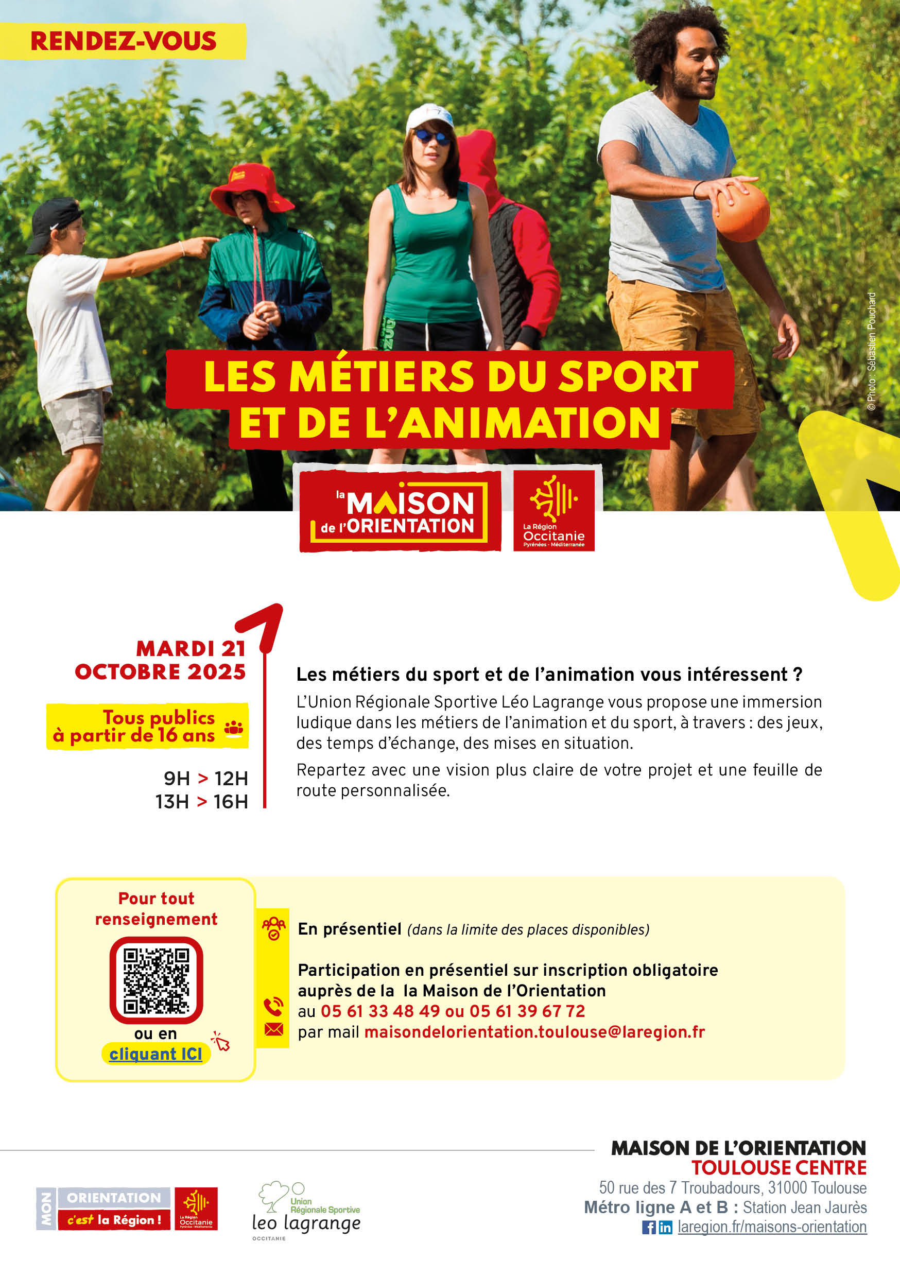 Participation en présentiel sur inscription obligatoire auprès de la la Maison de l’Orientation au 05 61 33 48 49 ou 05 61 39 67 72 par mail maisondelorientation.toulouse@laregion.fr