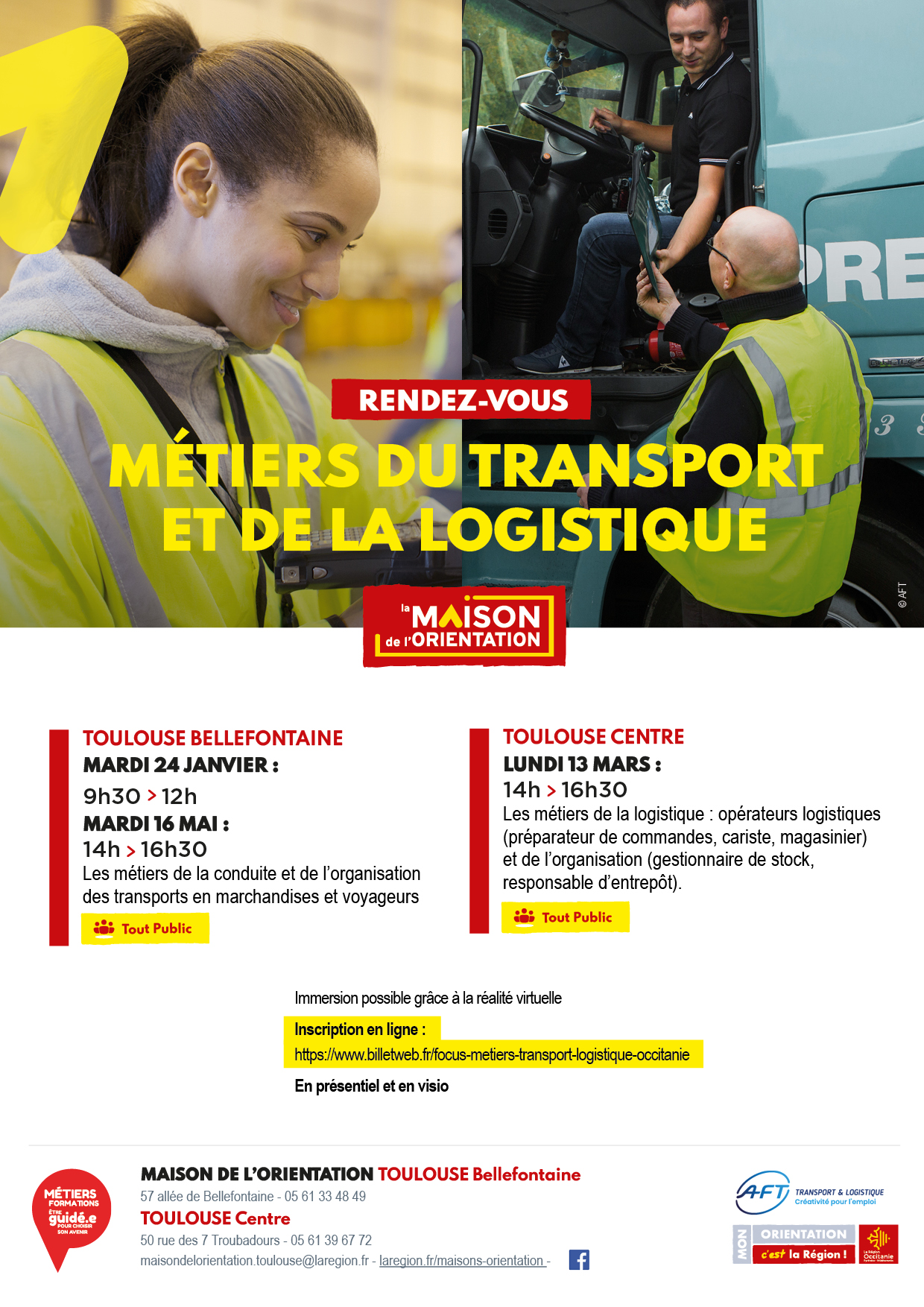 Inscription en ligne : https://www.billetweb.fr/focus-metiers-transport-logistique-occitanie En présentiel et en visio.