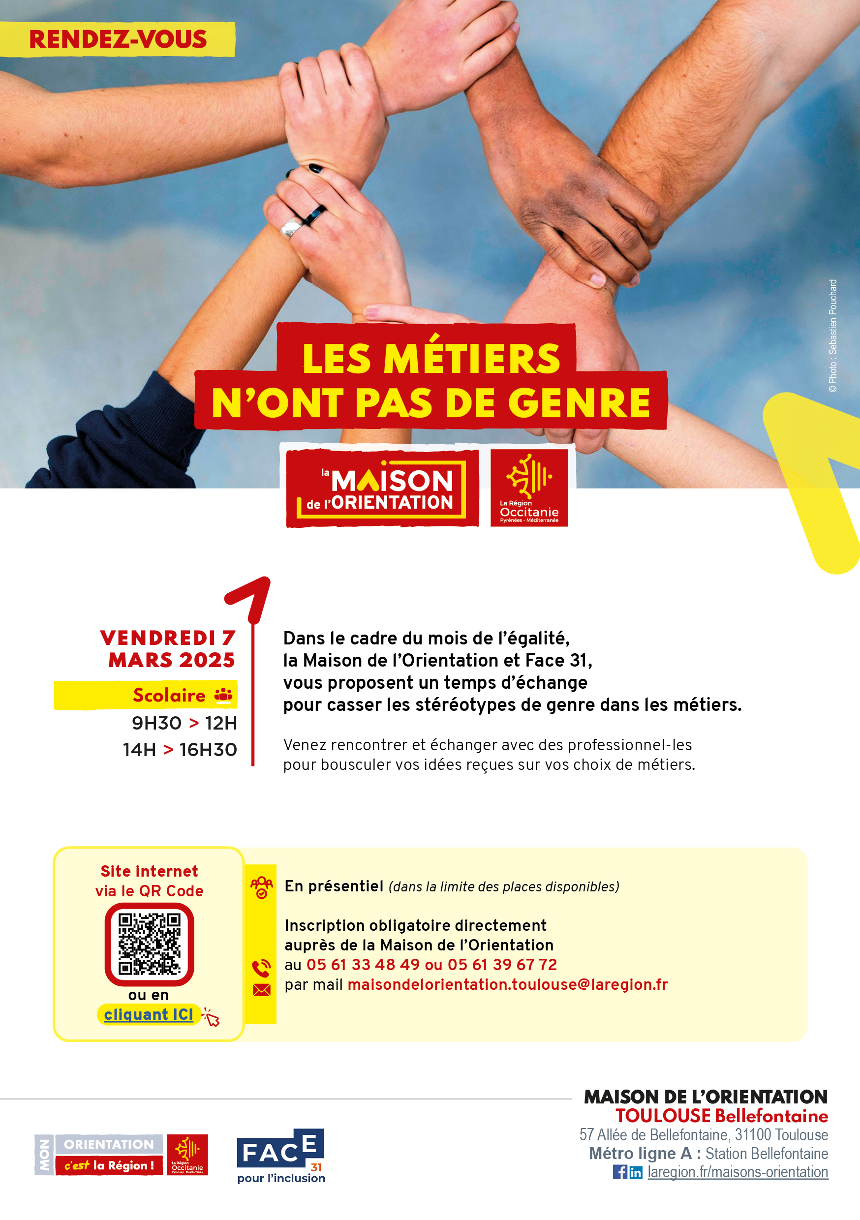 Dans le cadre du mois de l’égalité, la Maison de l’Orientation et Face 31, vous proposent un temps d’échange pour casser les stéréotypes de genre dans les métiers.
