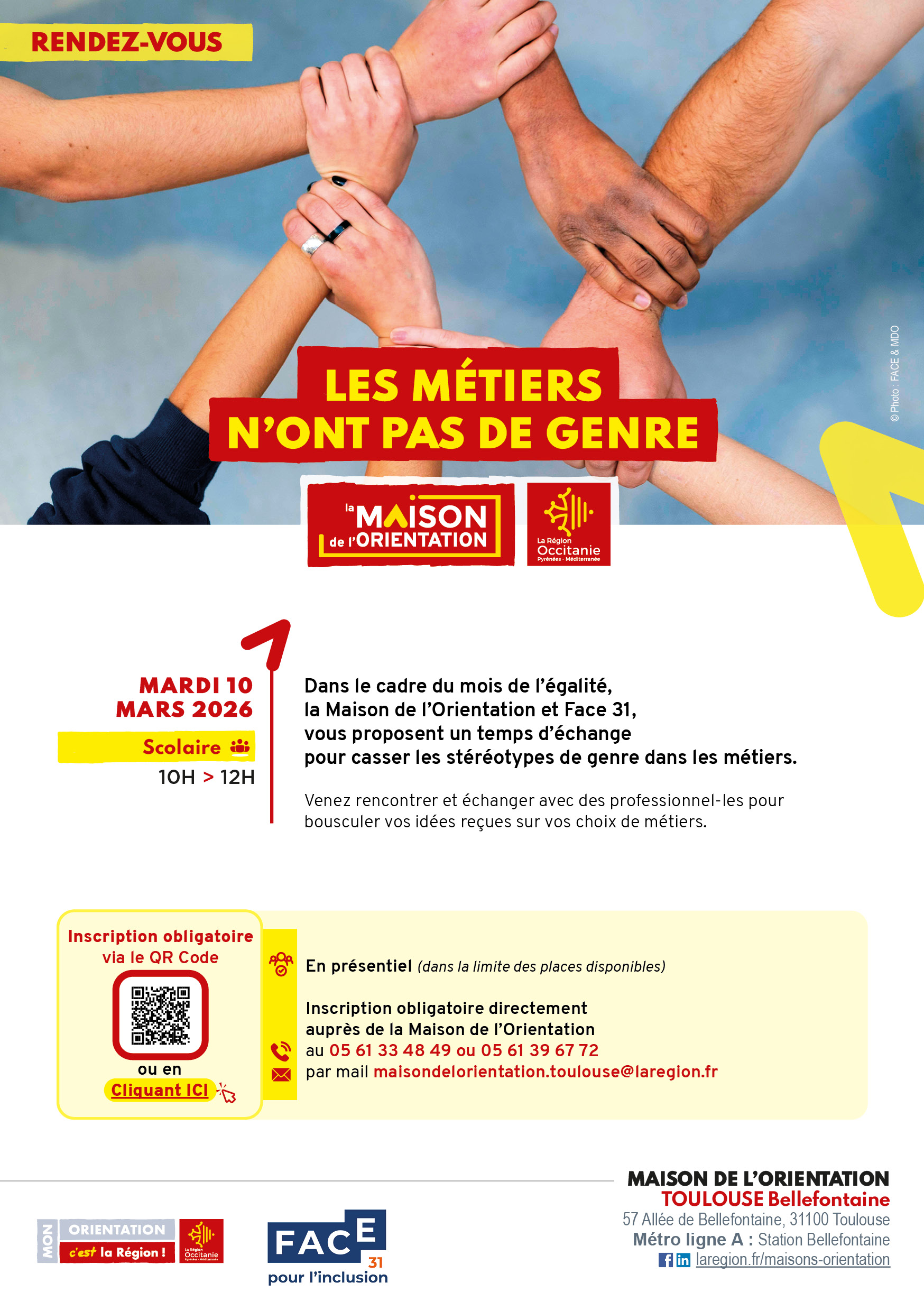 Dans le cadre du mois de l’égalité, la Maison de l’Orientation et Face 31, vous proposent un temps d’échange pour casser les stéréotypes de genre dans les métiers.