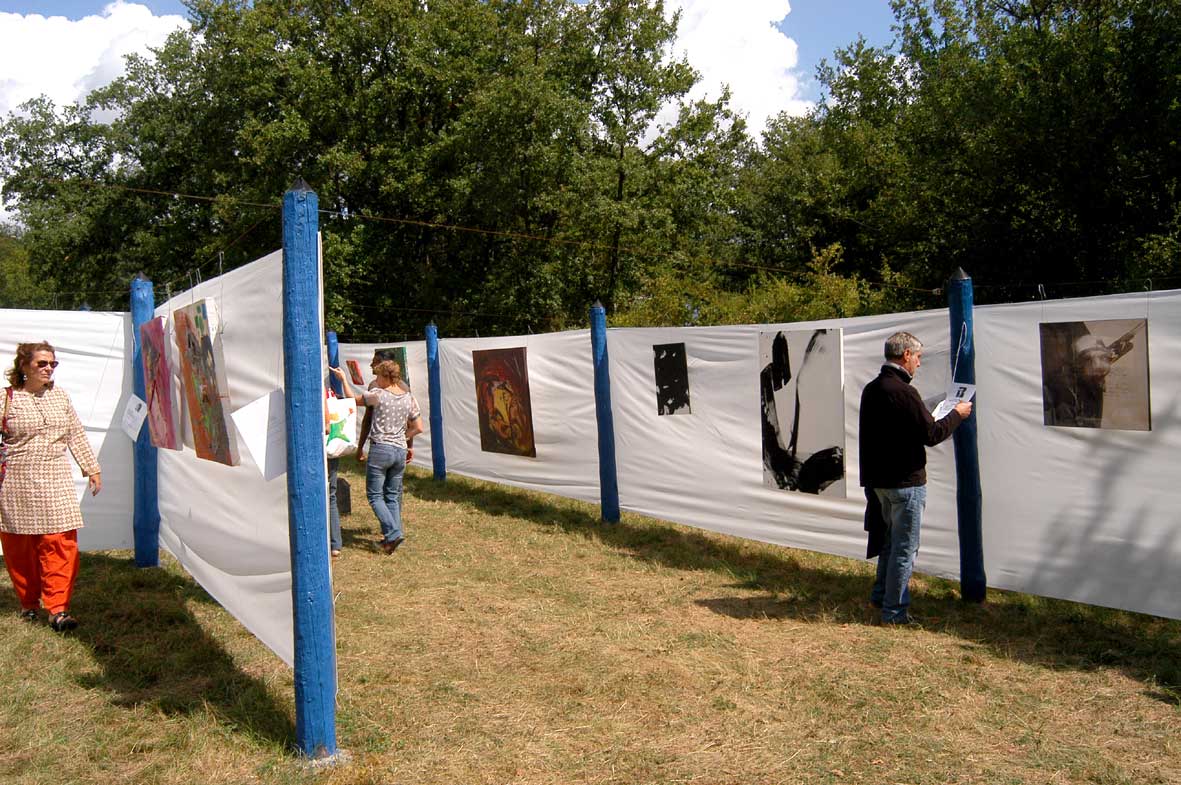 Suivant le principe de ces rencontres, amateurs d’art et connaisseurs peuvent acquérir lors d’une vente au enchères en plein champ le fruit de la résidence d’artistes de l’année. A ce choix déjà large s’ajouteront exceptionnellement tous les tableaux qui, faute de temps, n’ont pu être proposés les années précédentes. Dans cette galerie sans portes, le public peut dès le matin découvrir les tableaux exposés sur des murs en tissu et en début d’après-midi, les œuvres sont dispersées sous le marteau d’un commissaire priseur. Seul, le vendredi est consacré à la vente de dessins sous les tentes.
