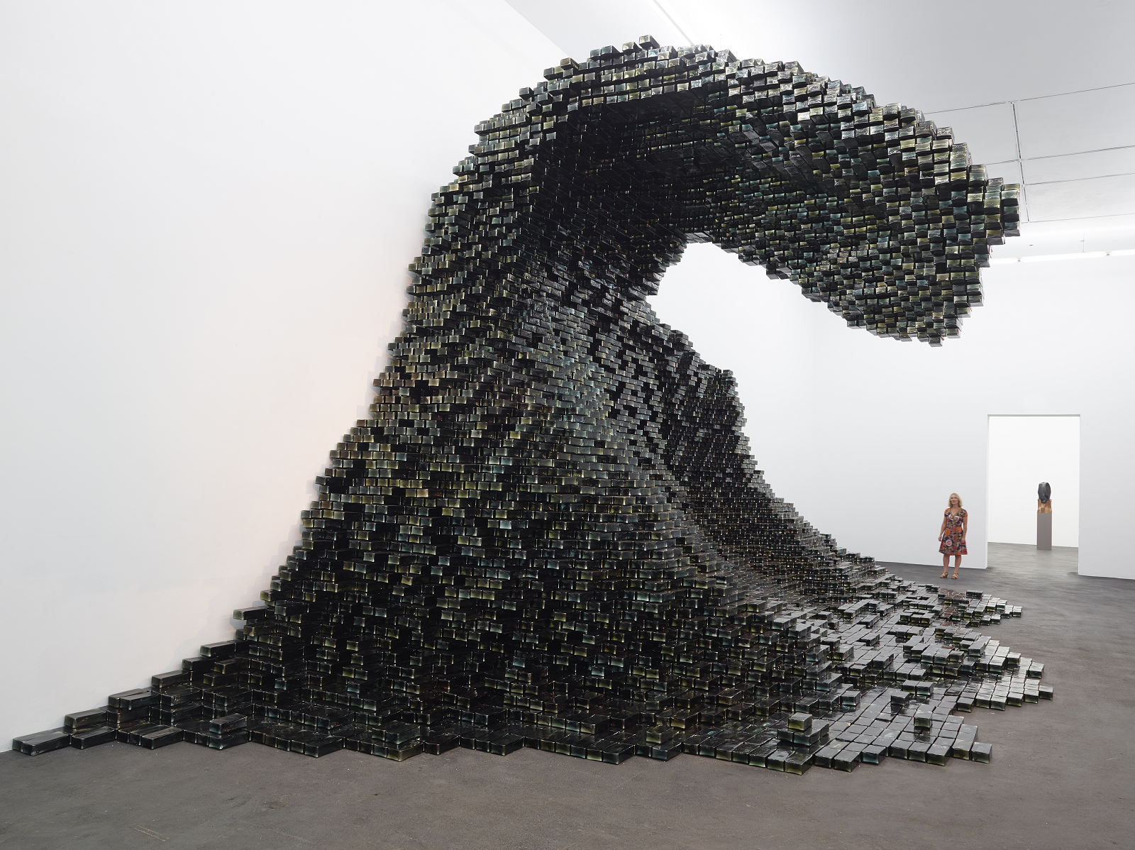 D’emblée, Othoniel imprime sa signature. Une immense vague, faite de milliers de briques de verre empilées sur 6 mètres de haut et 15 mètres de long, accueille le visiteur au rez-de-chaussée. Spécialement conçue pour le lieu, « The big wave » (« la grosse vague ») révèle ainsi tout le spectaculaire de l’exposition, qui a trouvé au Centre régional d’art contemporain de Sète un écrin à sa mesure. Ancienne friche industrielle, le centre d’art héberge une soixantaine de sculptures inédites de l’artiste, souvent monumentales, jusqu’au 28 septembre. Une dizaine de peintures et plus d’une centaine d’œuvres sur papier complètent cette exposition intitulée « Géométries amoureuses ».