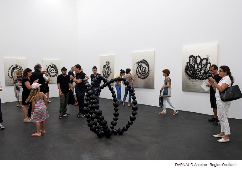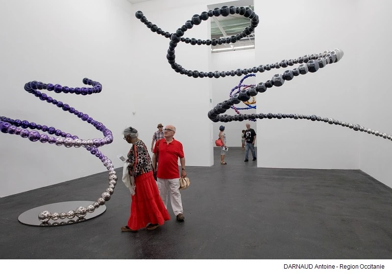 l’exposition « Géométries amoureuses » est en fait une double exposition. La première au Centre régional d’art contemporain comme évoqué ci-dessus, et la seconde à Montpellier, au Carré Sainte-Anne. Cette dernière présente une cinquantaine d’oeuvres de Jean-Michel Othoniel que l’artiste conserve chez lui depuis 15 ans. Moins sombres, plus ouvertes encore au merveilleux, les sculptures sont là aussi suspendues, au-dessus d’un parterre de briques de verre bleues. Comme à Sète, l’artiste a pensé son installation spécialement pour le lieu.