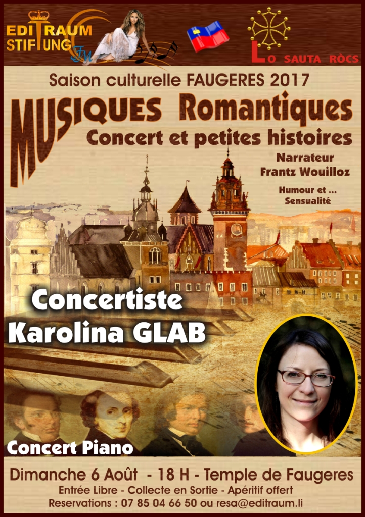 Karolina Glab, concertiste polonaise, interprétera au piano de concert Chopin, Brahms ou Schubert – Ce programme romantique par excellence, se veut une promenade toute en douceur pour nous faire cheminer sur les sentiers de la rêverie et de la détente. Mélodies connues ou à redécouvrir seront au rendez-vous. Tous ces compositeurs dont la vie est à elle seule un roman, nous montrent une autre façon d’exister, d’appréhender le monde en des temps pas si éloigné où l’audace, le risque au quotidien ne faisait peur à personne. Des anecdotes truculentes de la vie de ces compositeurs, des parenthèses de vie tantôt drôle, ubuesque ou émouvante, vous seront contées avec humour par Frantz Wouilloz-Boutrois entre deux exécutions de ces brillantes partitions. Un hymne a l’amour !