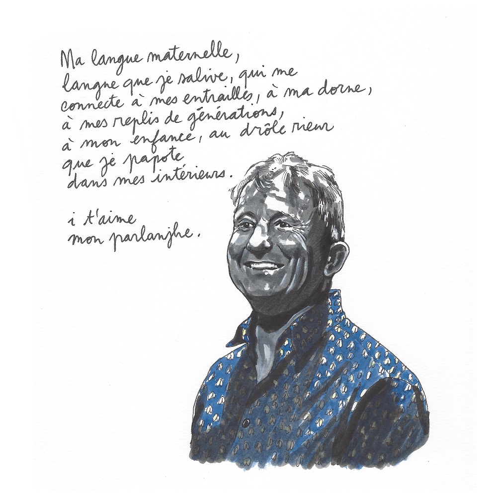 La langue est son outil de travail et le voilà qu’il parle de son outil, il met des mots sur les siens, le français qu’il adore, sa langue de tête, et le patois, sa langue émotionnelle.
