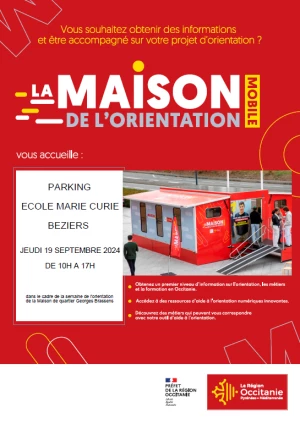 Dans le cadre de la semaine de l’orientation organisée par la Maison de Quartier Georges Brassens, la Maison de l’Orientation Mobile et les équipes de la Région seront présentes à Béziers le 19 septembre 2024 !