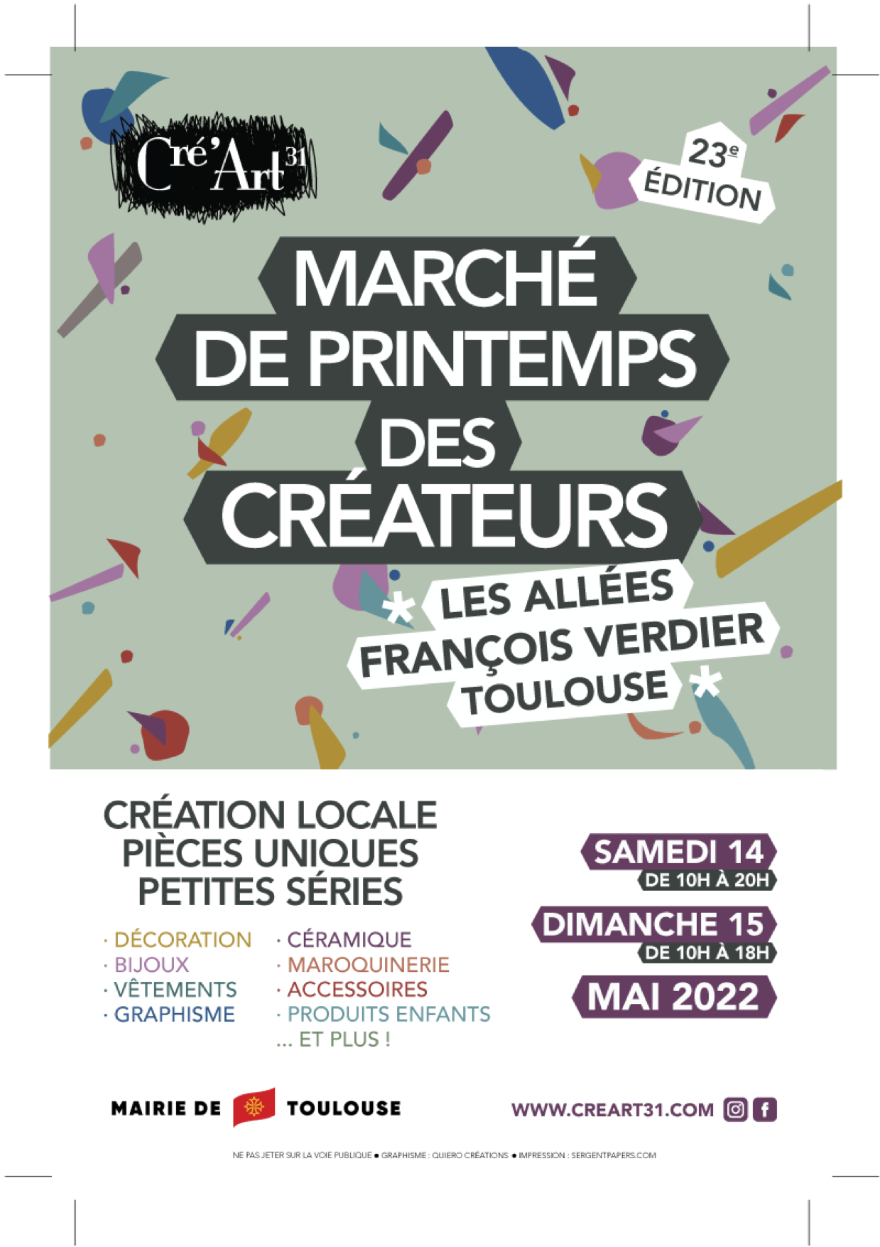 L’association toulousaine Cré’Art 31 organise son 24 ème marché de Créateurs, le samedi 14 et dimanche 15 mai. Notre évènement met l’accent sur des créations locales de qualité.