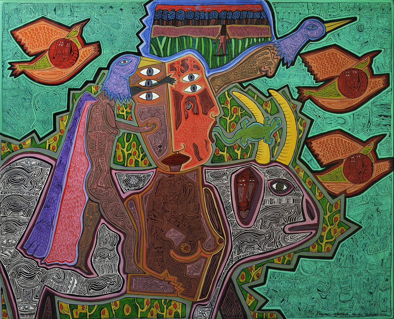 Son œuvre étonnante, généreuse, peut aussi bien faire penser aux tapisseries hallucinées des Indiens Huichols, qu’à l’expressionnisme africain ou océanien ; le bestiaire le plus inattendu voisine avec les citations de poètes surréalistes ou d’anarchistes célèbres ; les corps contiennent d’autres corps, les paires d’yeux se multiplient…