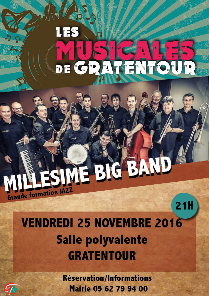 Créé en 2008, le Millésime Big Band rassemble seize musiciens amateurs et un chanteur, dirigés par Gines Mendez. Le Millésime Big Band interprète un répertoire varié à deux facettes : des instrumentaux jazz, latinos, funk, volontairement choisis parmi les compositeurs américains contemporains tels Chick Corea ou Benny Golson et des morceaux chantés par le crooner de l’orchestre dans la lignée de Frank Sinatra, Stevie Wonder ou Claude Nougaro. Le Millésime Big Band, « cru 2016 », se produit actuellement dans les plus grands rassemblements musicaux du grand Sud-Ouest : Colomiers, Albi, Leucate, Toulouse.