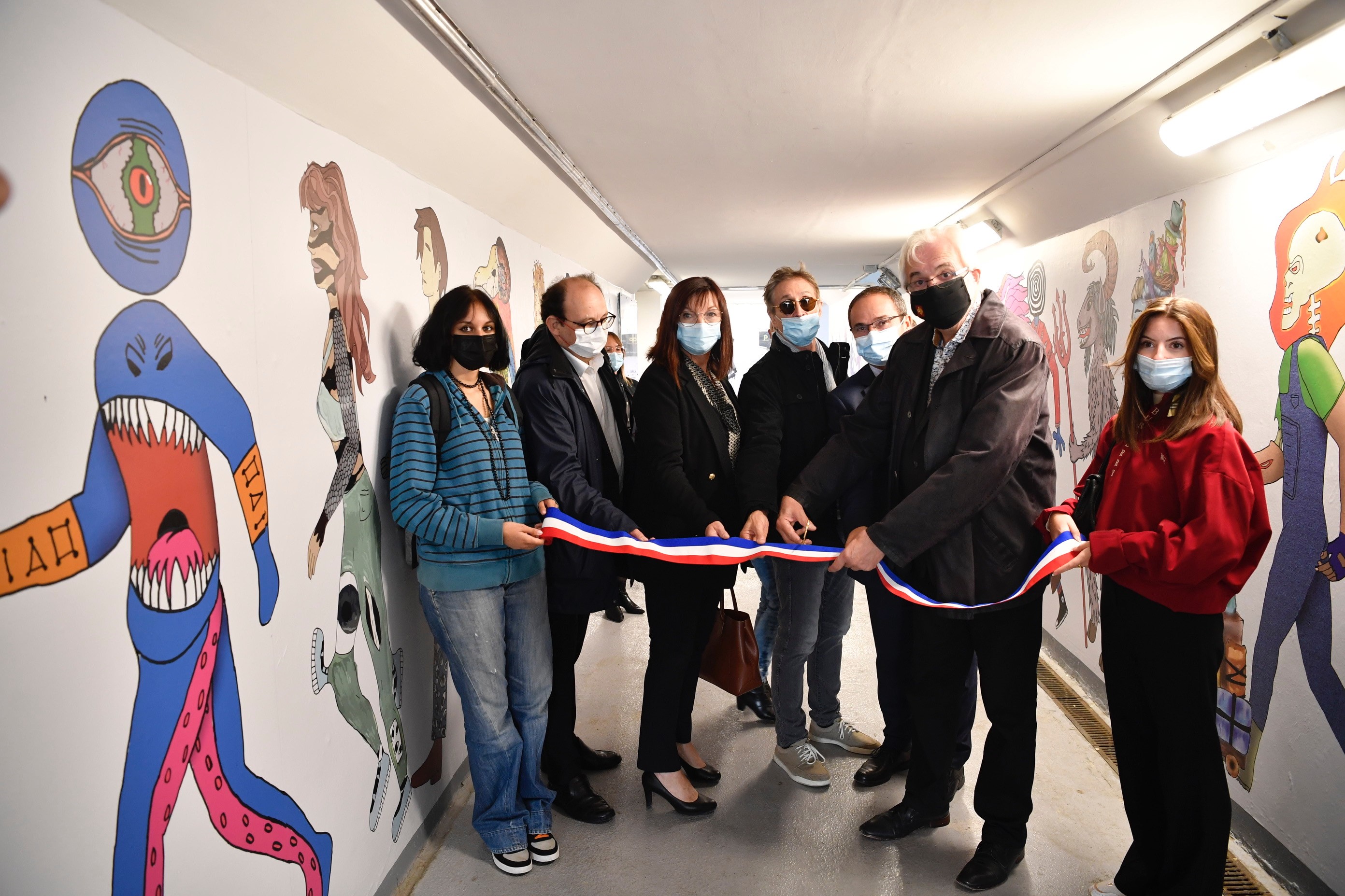 Soucieuses de promouvoir la culture sous toutes ses formes et dans un esprit de proximité avec les habitants, la Région Occitanie et SNCF Gares & Connexions ont pris le parti de mettre en avant de jeunes artistes locaux en herbe pour réaliser cette fresque. 50 élèves lunellois de 2nd et de 1ère du lycée Louis Feuillade ont ainsi été invités à exprimer leur talent créatif pour répondre à cette ambition. Tous engagés dans une option ou une spécialité artistique, ils ont répondu avec enthousiasme à cet appel, dans un contexte inattendu qui a largement influencé leur œuvre : un confinement total dû à la pandémie liée à la COVID-19. Sous l’impulsion de leur professeur, ces lycéens ont su rester mobilisés pendant cinq mois pour finaliser une œuvre complète et cohérente malgré l’isolement. La solution ? Réaliser une succession de personnages différents mais répondant tous à un courant artistique commun. Pour cette fresque, la figuration narrative libre a inspiré la créativité des élèves, style présent dans les œuvres d’artistes locaux de renoms tels que le sétois Hervé Di Rosa ou Robert Combas, formé à Montpellier.