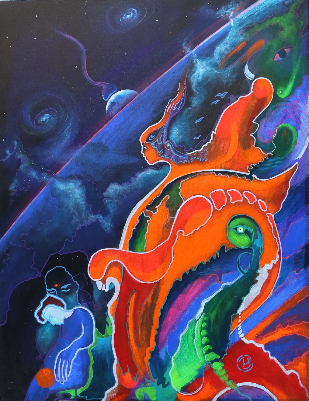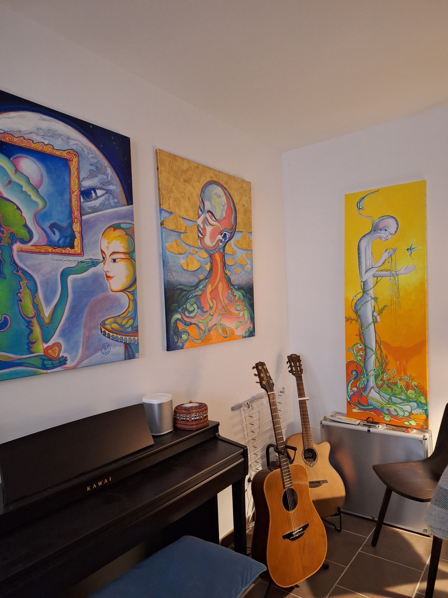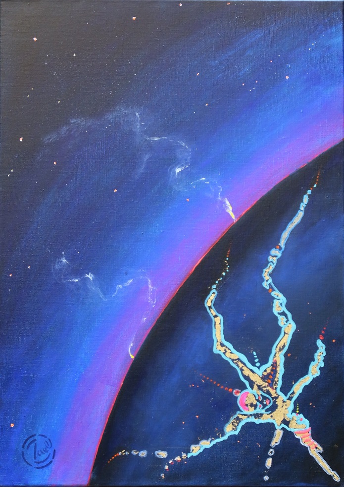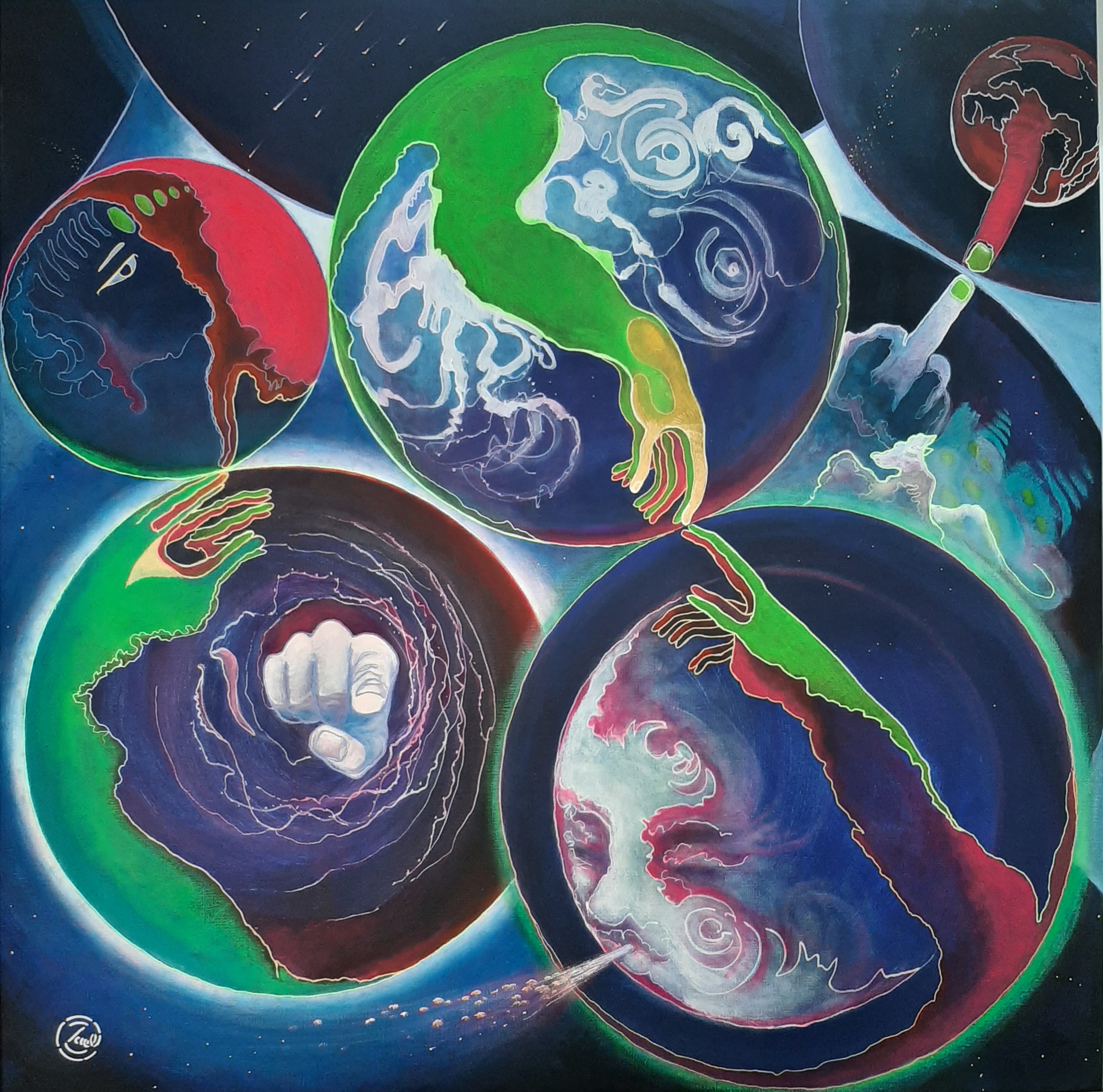 Harmonie correspondent à ce que je souhaite exprimer à travers ma peinture. Peintre depuis mon plus jeune âge, sculpteur et restaurateur d’œuvres d’art, mon parcours artistique est éclectique et passionné. J’ai toujours été attiré par le cosmos et le surréalisme. Je me sens relié à l’infini, en moi et autour de moi. Cela est pour moi une véritable source d’inspiration et d’éveil spirituel. Enveloppé par cet amour du cosmos, ce grand univers est devenu mon ami, ma source fondamentale infinie de créativité. Je définis ma peinture de cosmosophique (sagesse du cosmos). Je créé une transmission artistique, poétique, méditative en relation avec l’infiniment petit et l’infiniment grand.