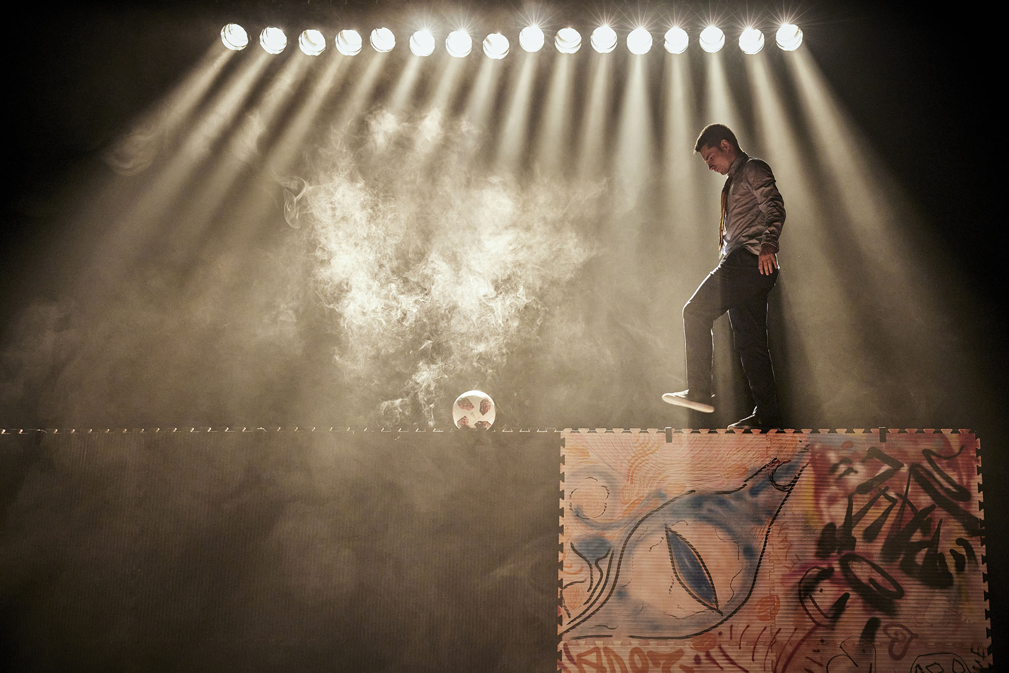 Le spectacle repose sur une maîtrise technique accrue du football freestyle couplée à une performance physique circassienne autour de l’acrobatie, caractéristique d’un sport où tout se passe en une fraction de seconde.