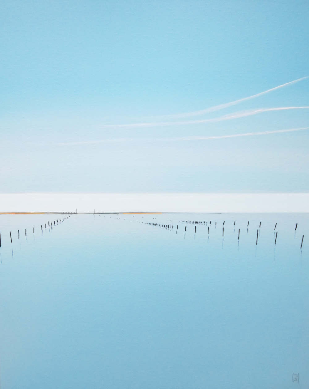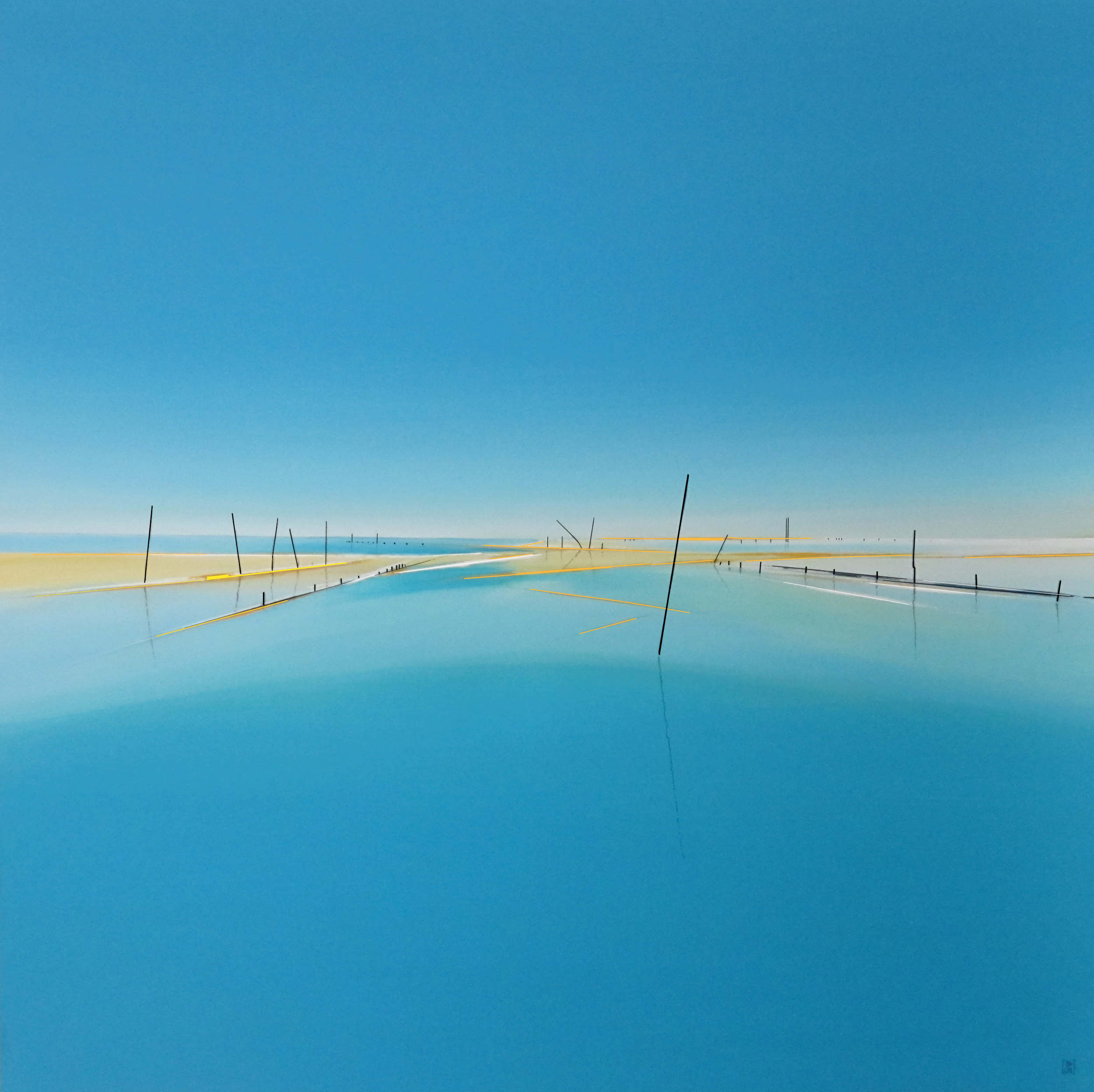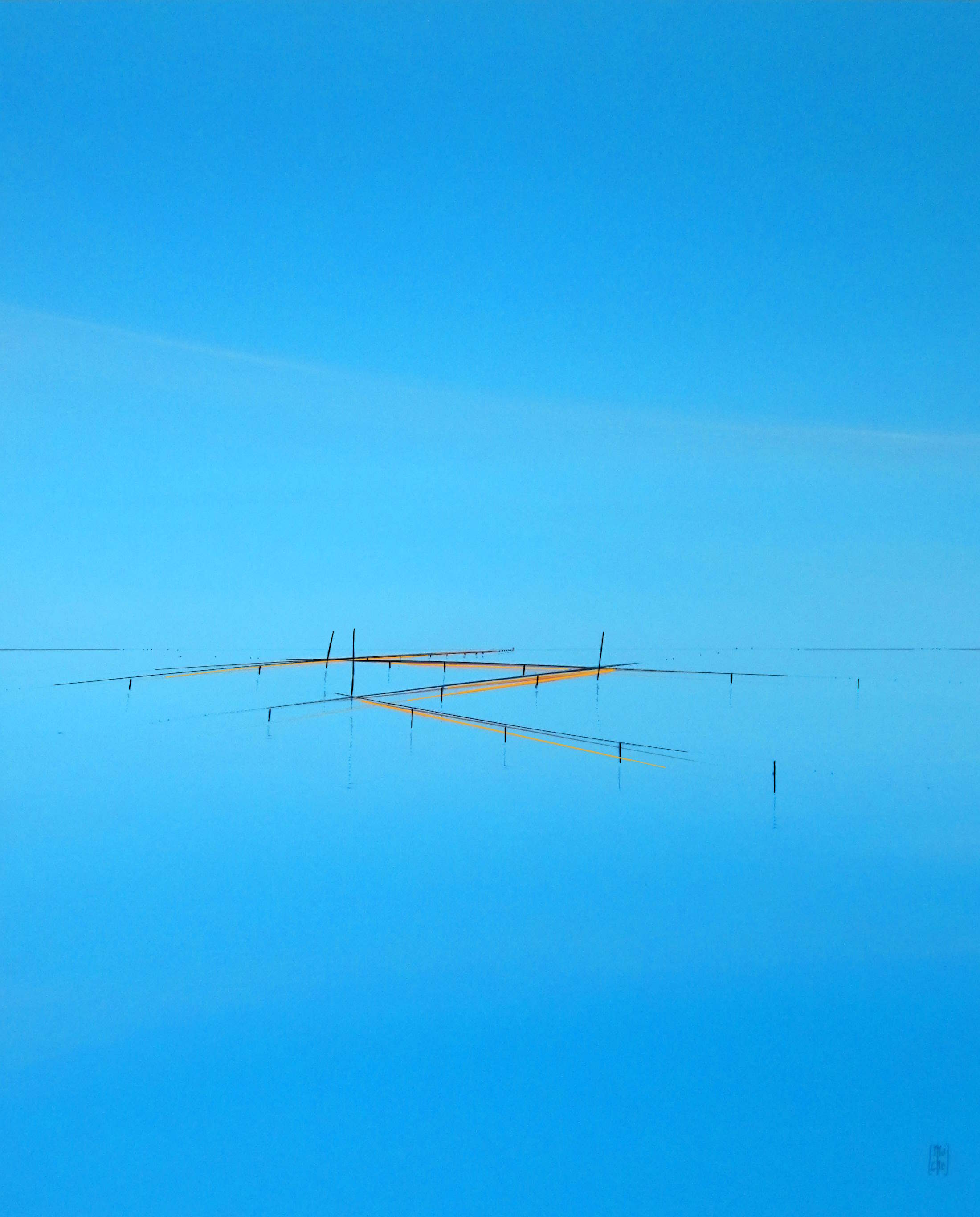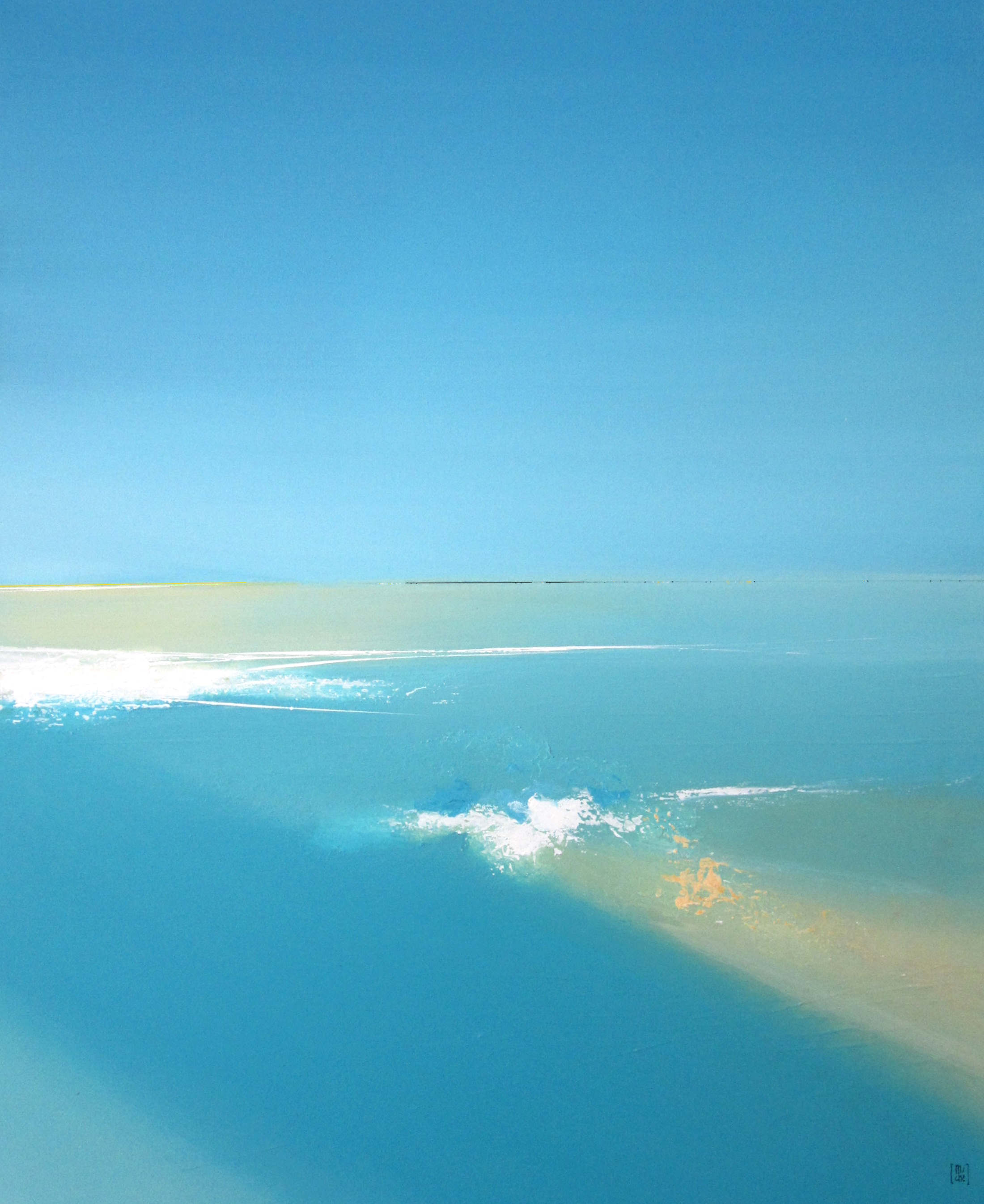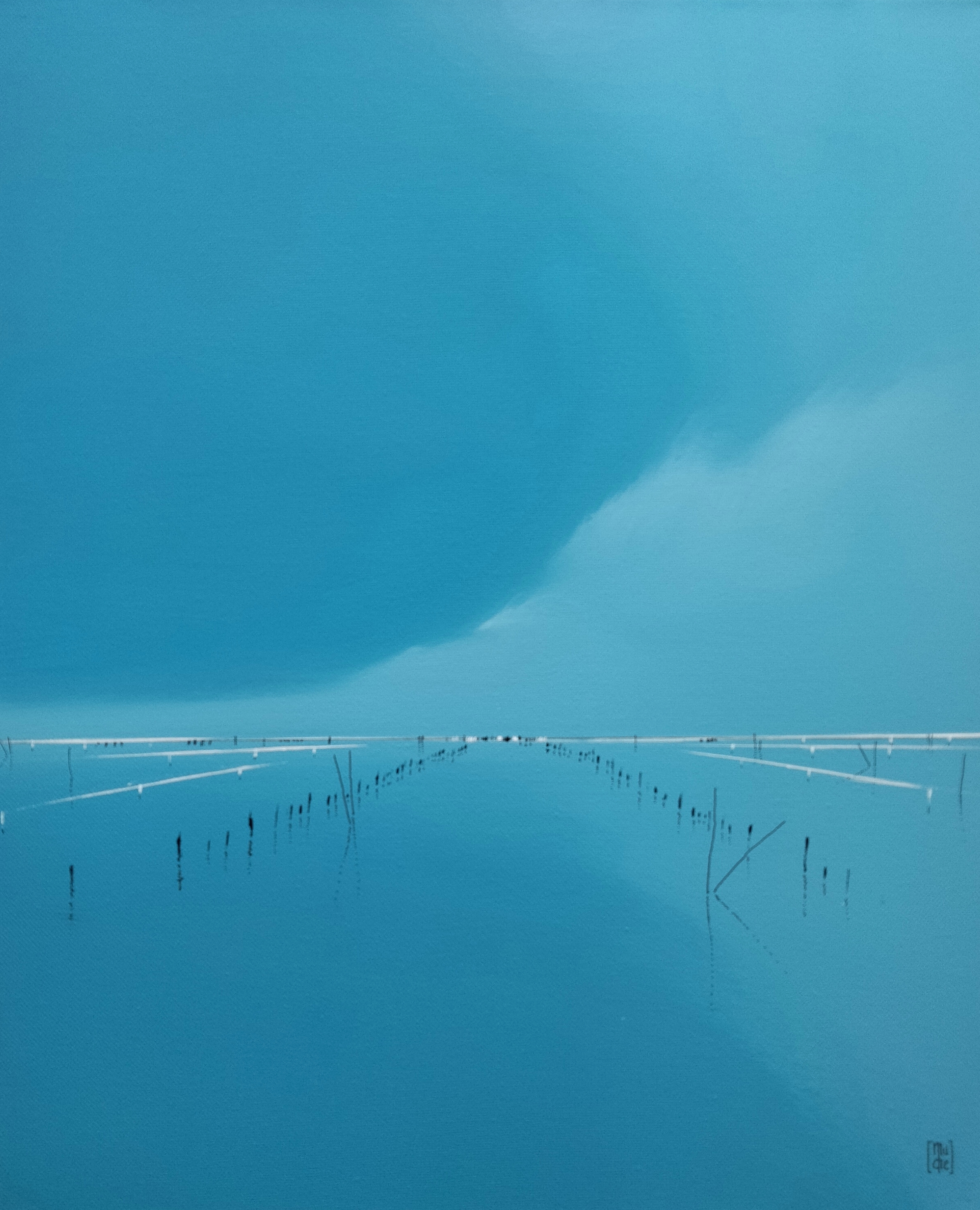 Le minimalisme des moyens picturaux est un désir de pureté, de simplicité. Rien ne doit arrêter le regard, l’œil plonge vers d’essentiel, seuls quelques éléments verticaux dont les reflets sont magiques créent un rythme qui amènent à entrer plus loin dans le tableau. Les couleurs et les bleus en particulier ouvrent l’espace jusqu’à l’horizon.