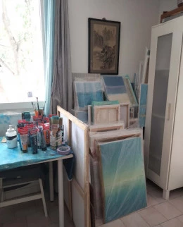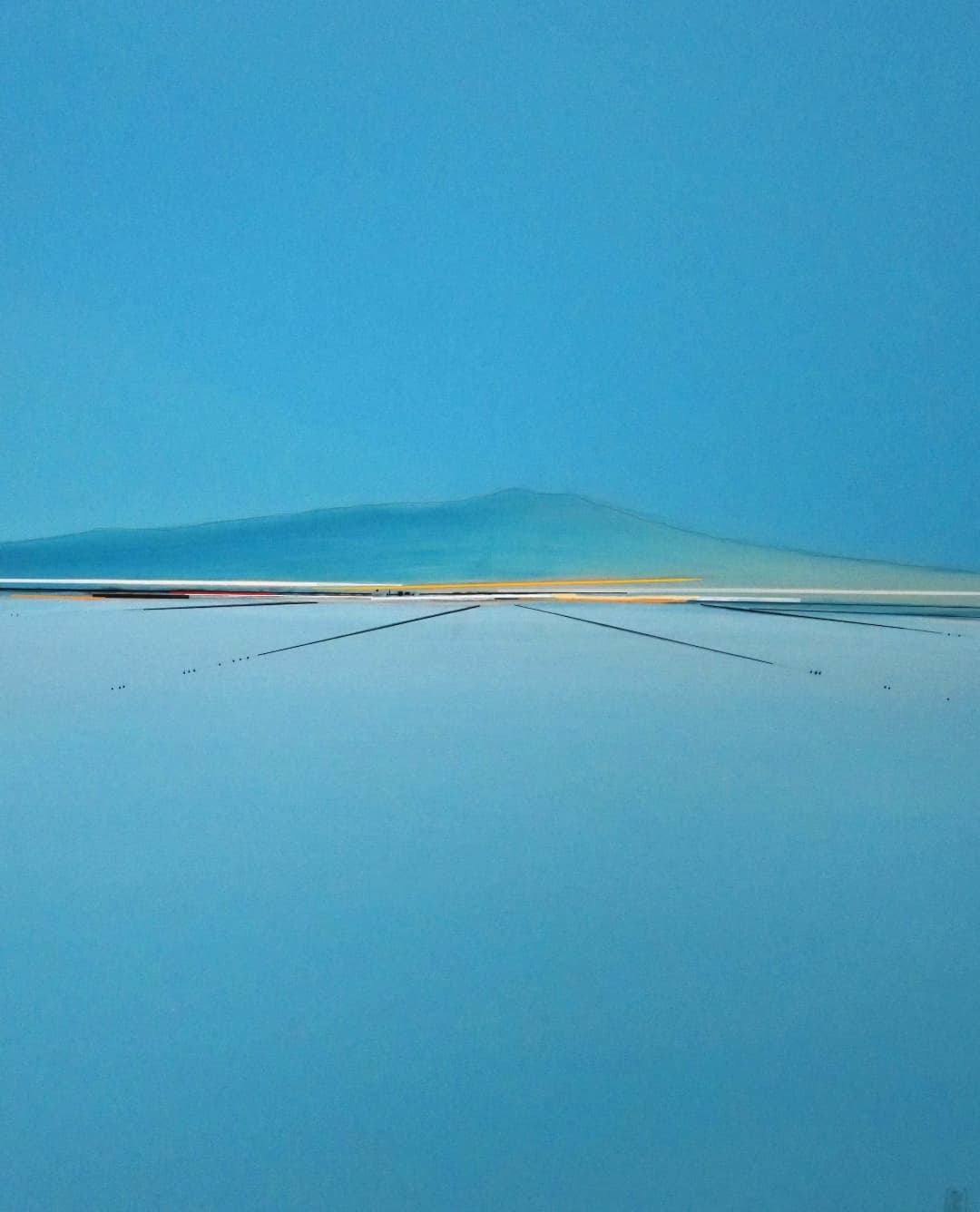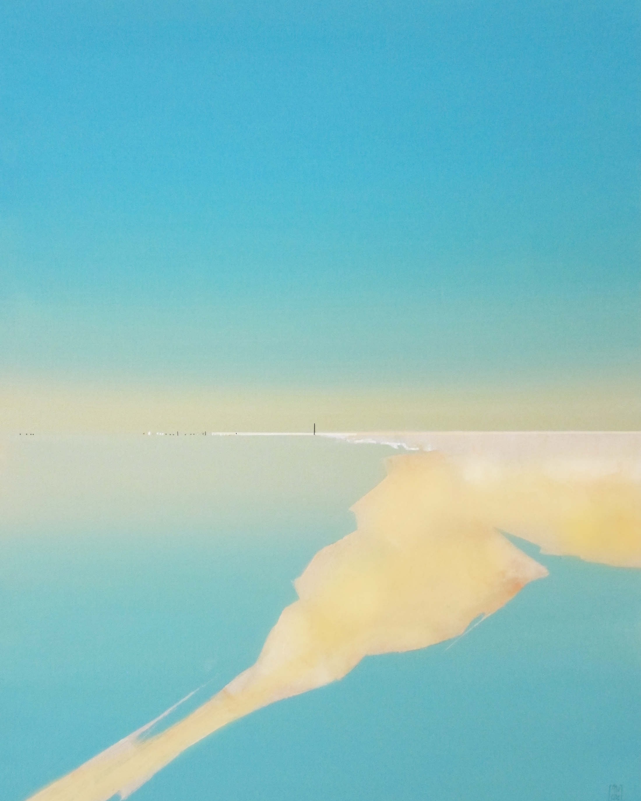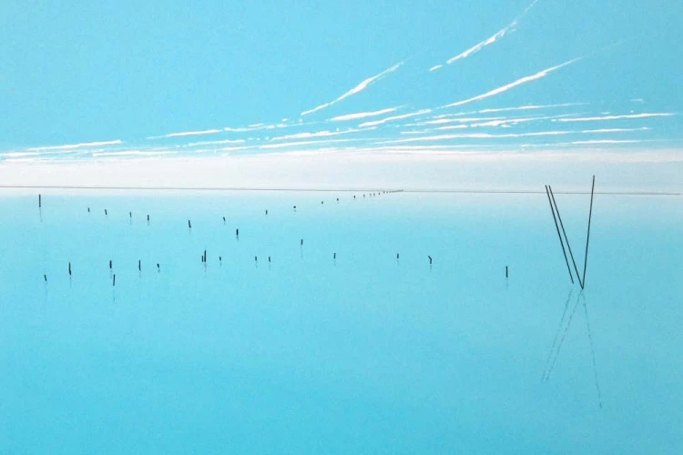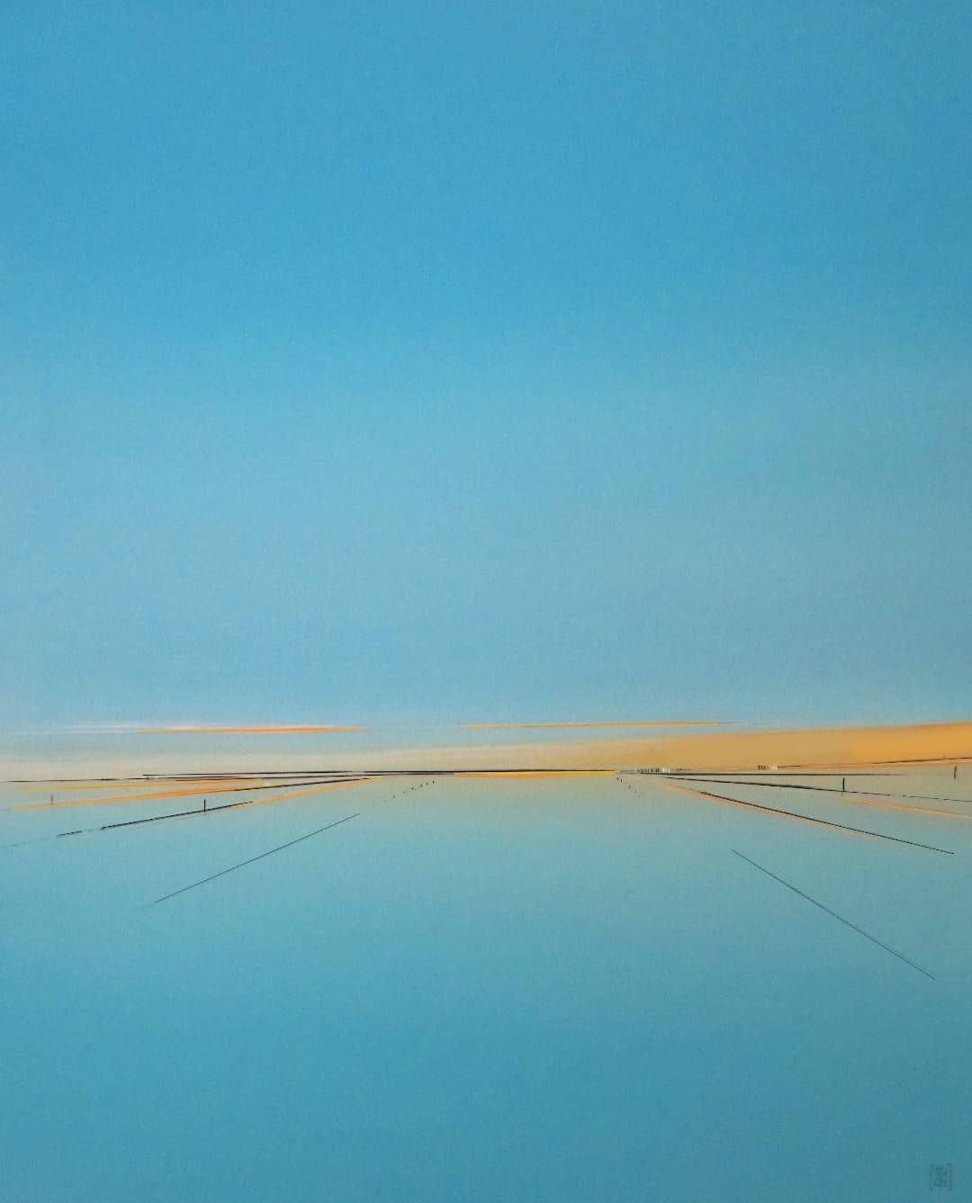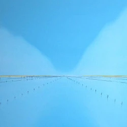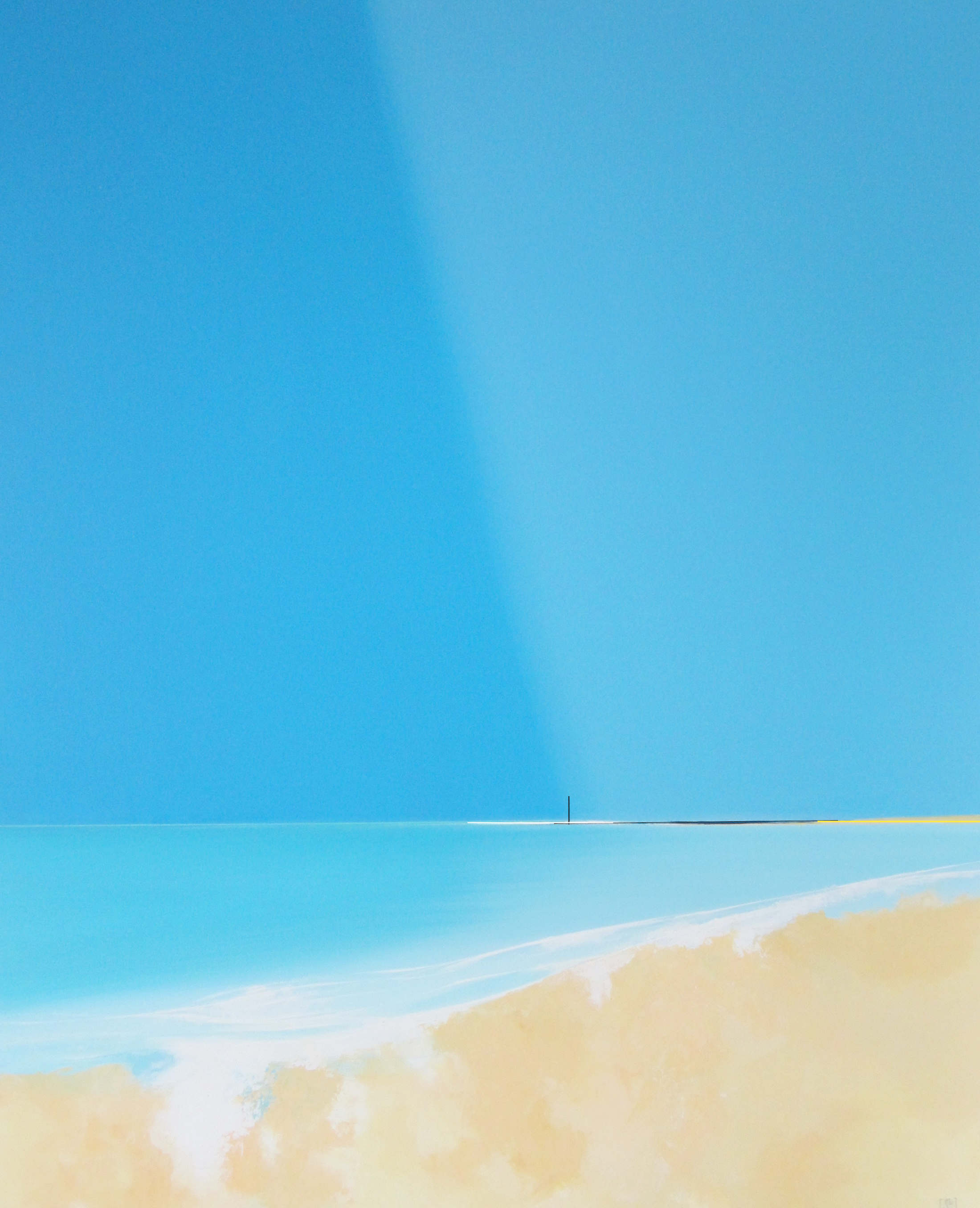 Le minimalisme des moyens picturaux est un désir de pureté, de simplicité. Rien ne doit arrêter le regard, l’œil plonge vers d’essentiel, seuls quelques éléments verticaux dont les reflets sont magiques créent un rythme qui amènent à entrer plus loin dans le tableau. Les couleurs et les bleus en particulier ouvrent l’espace jusqu’à l’horizon.