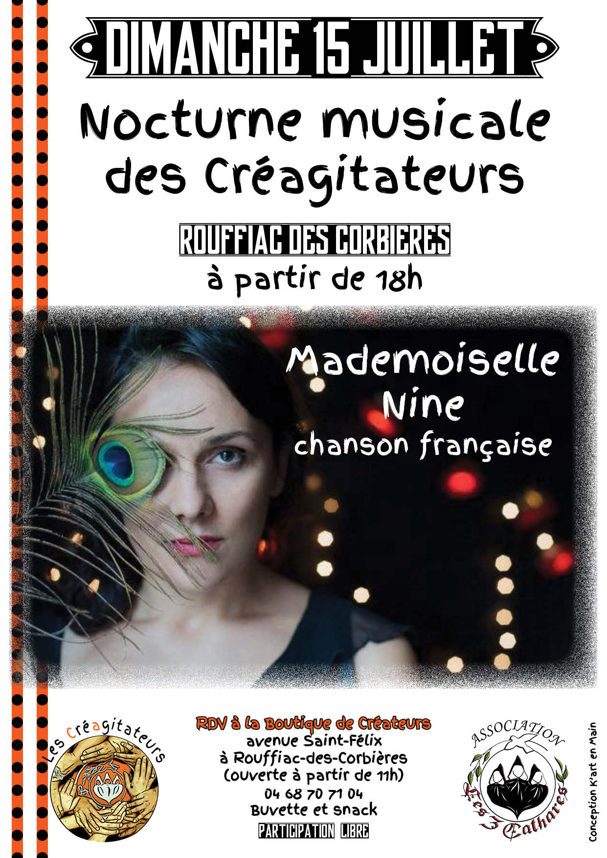 Infos pratiques : Nocturne musicale avec Mademoiselle Nine dimanche 15 juillet à partir de 18 h (participation libre), à la Boutique associative de créateurs, avenue St-Félix à Rouffiac-des-Corbières, 04 68 70 71 04, www.creagitateurs.com