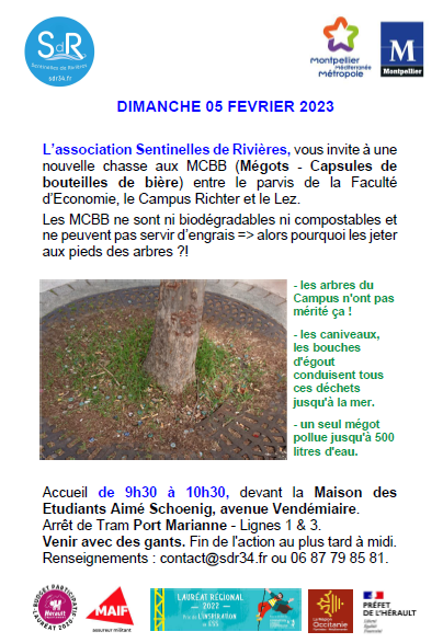 L’association Sentinelles de Rivières, vous invite à une nouvelle chasse aux MCBB (Mégots - Capsules de bouteilles de bière) entre le parvis de la Faculté d’Economie, le Campus Richter et le Lez.