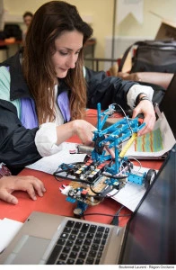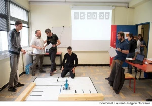 Objectif de l’épreuve : déplacer, à l’aide d’un robot miniature, des palettes (miniatures elles aussi), d’une étagère vers une autre, sur un plateau disposé au sol. Organisés en 3 équipes de 2, les binômes vont devoir « coder » pour paramétrer leur robot, afin qu’il effectue les tâches demandées. Vitesses, distances, virages, tout est minutieusement calculé par les étudiants. « Sur notre robot on a mis des capteurs de lignes et des capteurs ultrasons pour qu’il détecte quand on s’approche de la palette », précise Samuel . Une technicité évaluée sur trois épreuves de 10 minutes, où le robot doit parfaitement s’exécuter. La pertinence des choix techniques est également notée par le jury. « On a reproduit le même schéma d’épreuve que pour les nationales », indique Eric Dubreuil. Très impliqué dans l’organisation des sessions régionales à Polytech, il a déjà emmené des étudiants sur le podium national, avec notamment une médaille d’argent remportée l’an dernier à Bordeaux.