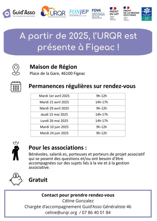 Pour prendre rendez-vous, contacter Céline Gonzalez, chargée d’accompagnement Guid’Asso Généraliste 46 : celine@urqr.org / 07 86 40 01 84