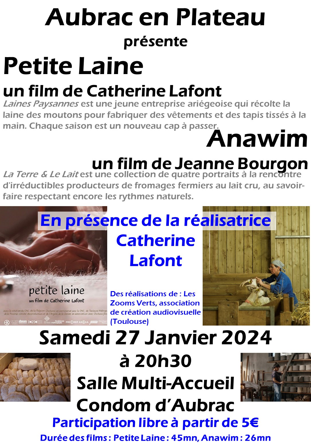 Projection de 2 films documentaires : Petite laine (45mn) de Catherine Lafont et Anawin (26mn) de Jeanne Bourgon, en présence de la réalisatrice Catherine Lafont. Thématiques agricoles.