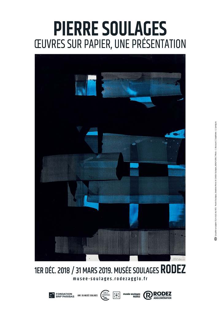 Du 4 décembre 2018 au 31 mars 2019, le musée Soulages présente son ensemble de 118 « peintures sur papier », des brous de noix, gouaches, encres de Chine, quelques fusains (100 de la collection permanente - 18 dépôts du peintre).