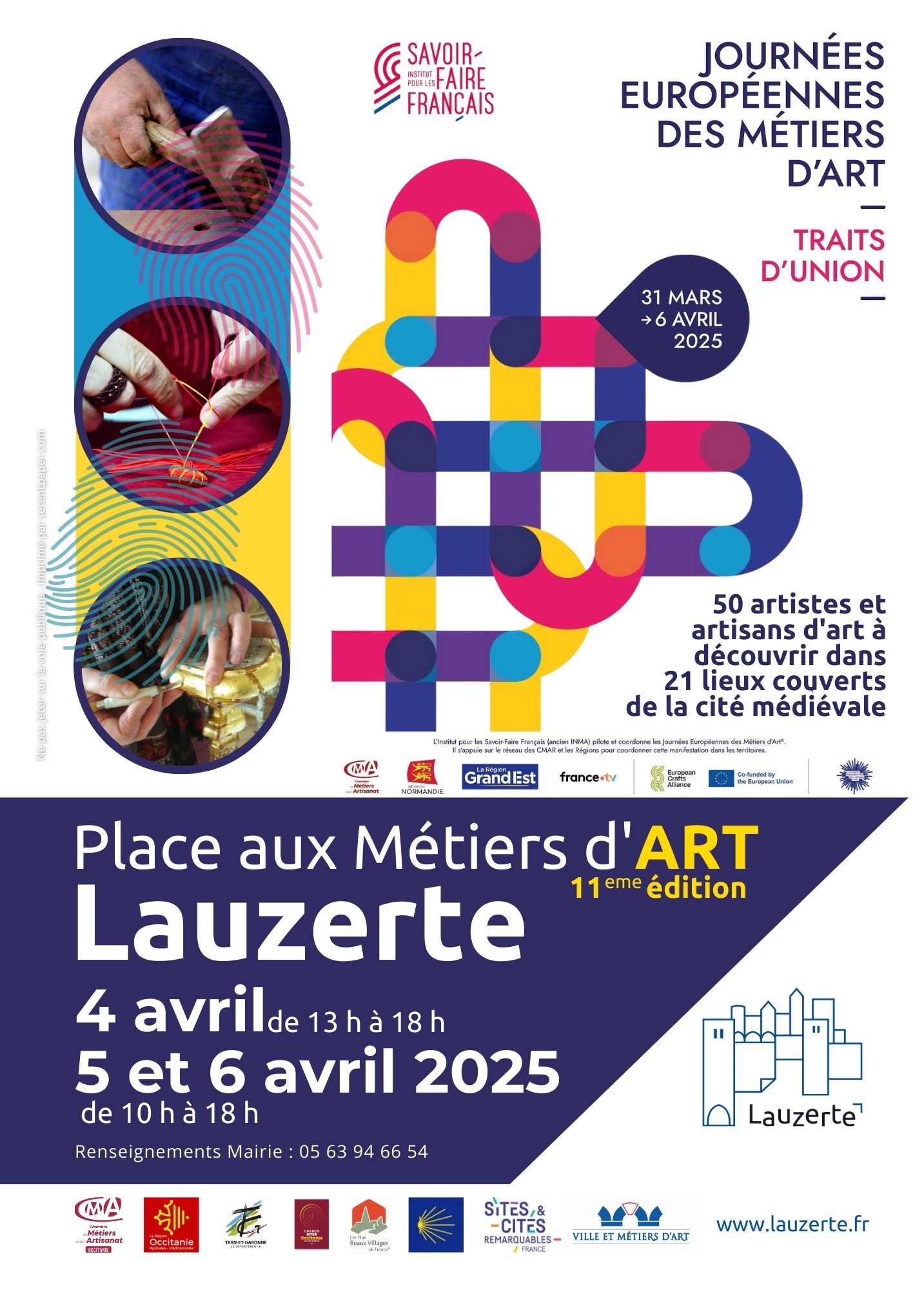 du 10 au 12 avril 2026 et accueillera entre 40 et 50 artistes et artisans d’art, répartis dans différents lieux de la cité médiévale, réalisant ainsi un véritable "parcours des arts". Vous pourrez découvrir grâce aux nombreux artisans et artistes présents, différents métiers et savoir-faire comme le : vannier, enlumineur, relieur, graveur, tourneur sur bois, sculpteur, joaillier/bijoutier, ébéniste, maroquinier, verrier, luthier, coutelier, potier, marqueteur, feutrier, calligraphe, tailleur de pierre, sellier harnacheur, forgeron, brodeuse, ennoblisseur textile, tisserande …pour une large représentativité des métiers d’art. Les journées Européennes des Métiers d’art à Lauzerte c’est l’occasion de venir visiter un des plus beaux villages de France et de venir découvrir des lieux qui sont pour l’occasion ouverts à la visite et au public, révélant ainsi le patrimoine architectural de Lauzerte. C’est également partir à la rencontre des savoir-faire d’artisans d’art talentueux. Ouvrez les portes des ateliers, franchissez le seuil des boutiques de notre belle cité médiévale à la rencontre de ces hommes et femmes talentueux. Profitez des 2 visites guidées gratuites de la cité médiévale de Lauzerte Samedi 11 avril à 16 h et Dimanche 12 avril à 16 H