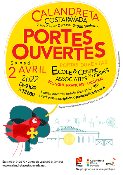Si vous souhaitez découvrir la Calandreta Costa Pavada (école et centre de loisirs associatifs), son fonctionnement, sa pédagogie, ses valeurs, ses locaux, sa convivialité… rendez-vous le samedi 2 avril 2022 de 9h30 à 12h30.
