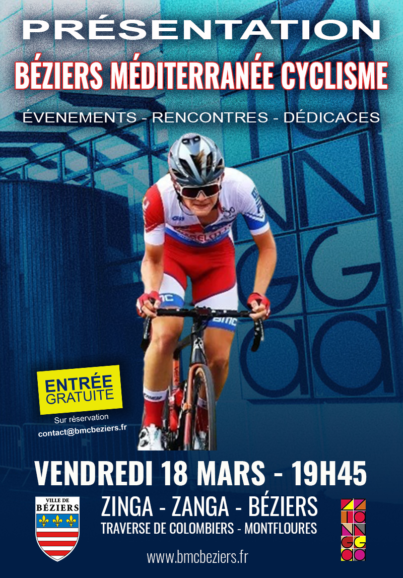 Le Béziers Méditerranée Cyclisme a le plaisir de vous convier à sa soirée de présentation qui aura lieu le Vendredi 18 mars à partir de 19h45 à la salle Zinga Zanga.