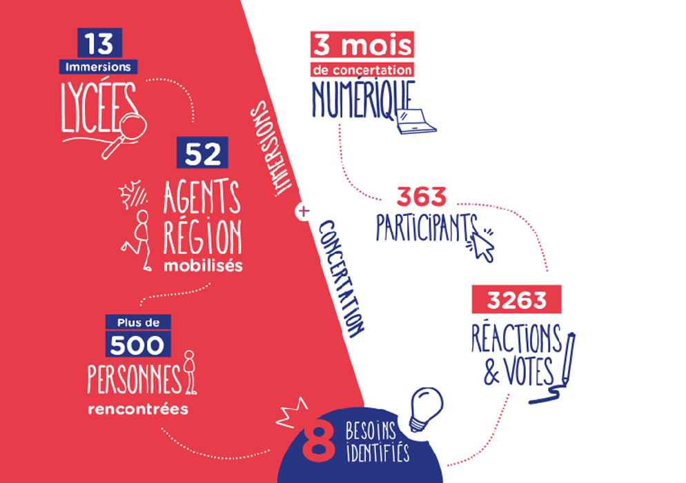 Sur le principe de l’enquête et de l’interview, des équipes pluridisciplinaires, composées d’agents régionaux des lycées et d’agents de différentes directions, sont allées à la rencontre des lycéen·ne·s, des équipes pédagogiques et plus largement de l’ensemble du personnel des lycées pour les interroger sur ce que serait pour eux le lycée de Demain.