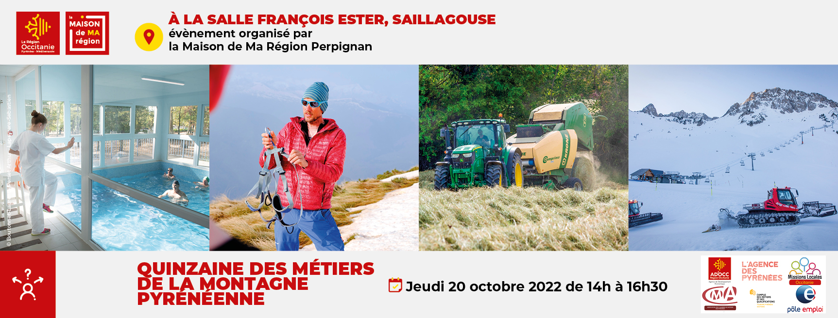 Vous êtes en recherche d’emploi, de formation, d’information sur vos possibilités d’orientation, vous souhaitez créer ou reprendre une entreprise dans le Massif Pyrénéen des Pyrénées-Orientales, nous vous proposons deux temps forts le 20 octobre prochain à Saillagouse. Un événement également organisé par trois autres Maisons de Ma Région, dans le cadre de la [Quinzaine des métiers de la montagne pyrénéenne->43922]