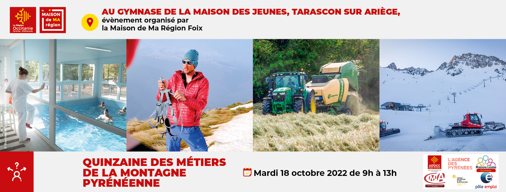 Le 18 octobre de 9h à 13h, la Maison de Ma Région à Foix vous propose, au gymnase de la Maison des jeunes de Tarascon-sur-Ariege une journée dédiée aux métiers de la montagne pyrénéenne, avec rencontres et échanges avec des professionnels. Un événement également organisé par trois autres Maisons de Ma Région, dans le cadre de la [Quinzaine des métiers de la montagne pyrénéenne->43922]