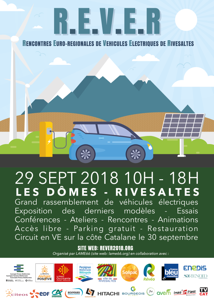 R.E.V.E.R. 2018 : Rencontres Eurorégionales de Véhicules Electriques de Rivesaltes les 28 et 29 septembre salle du Domes