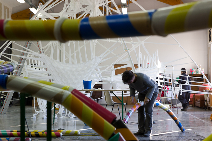 Les rebuts de l’Usine Well, bas immaculés et cônes bigarrés, sont une source inépuisable de matériaux de qualité réutilisés à des fins artistiques. Au fil des années une relation s’est créée entre Well et la Filature du Mazel au travers de cette récupération.