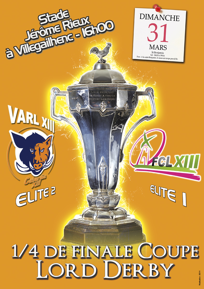 Ce dimanche 31 mars Villegailhenc Aragon RL en Cabardès XIII (Elite 2) reçoit le FC Lézignan (Elite 1) en quart de finale de la Coupe nationale Lord Derby.