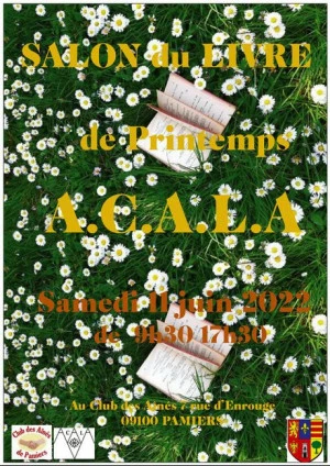 Samedi 11 juin l’Association de Création Artistique et Littéraire de l’Ariège et aussi Éditions ACALA organisent un Salon du Livre à Pamiers au Club des Aînés 7 rue d’Enrouge de 9h30 à 17h30 avec leurs auteurs et leurs adhérents afin de promouvoir leurs dernières créations littéraires .