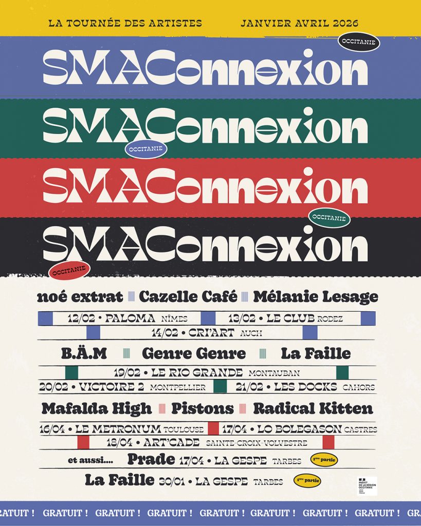 Les Scènes de Musiques Actuelles (SMAC) d’Occitanie s’unissent pour créer SMAConnexion, des concerts entièrement gratuits qui valorisent à la fois les salles du territoire et les artistes qu’elles accompagnent. À travers 3 mini tournées de 3 dates chacune, SMAConnexion offre une traversée musicale qui invite les publics à découvrir la richesse, la diversité et le rôle essentiel des SMAC dans l’écosystème culturel régional.