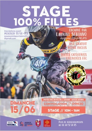 Le Soues Omnisports BMX organise un stage 100 % FILLES et 100 % GRATUIT (REPAS COMPRIS) le Dimanche 15 Juin de 10H à 16 H, encadré par Laurine SCHIAVO ; Diplômée d’Etat BEJEPS.