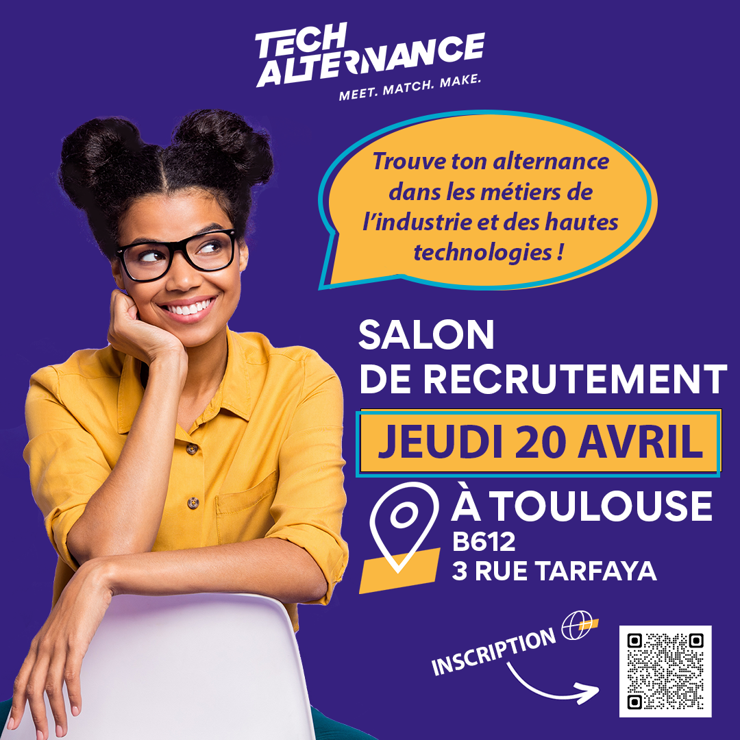 Tech alternance est une opération de recrutement d’alternants pour tous les niveaux de formation, du CAP à Ingénieur. Des organismes de formation, des entreprises et des candidats se retrouvent le jour du salon qui aura lieu cette année, le jeudi 20 avril de 9h à 17h au B612 à Toulouse. Toi aussi trouves ton alternance dans les métiers de l’industrie et des hautes technologies !