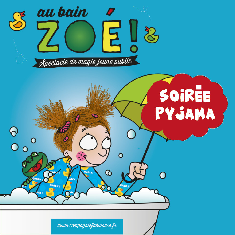 Habille-toi de ton plus beau pyjama et viens passer une soirée pyjama inoubliable avec Zoé ! Ton papa et ta maman t’accompagneront, en pyjama aussi s’ils le souhaitent. Le Théâtre de l’Embellie vous accueillera, parents et enfants, pour un moment privilégié dans une ambiance chaleureuse avec une collation (pizza, chips et grenadine à gogo). En plus Zoé te proposera d’assister à son spectacle qui sera suivi d’une animation en sa compagnie (sculpture de ballons, tours de magie, etc). Le spectacle : Au bain Zoé… Un plouf magique… Coâââ coâââ ! Voici Grigri la grenouille à la recherche de sa maison ! Splash ! Des parapluies enchantés pour rester au sec ! La la la ! Un Grand show musical de salle de bains ! Waaaouuu ! Des bulles de savon pas comme les autres ! …Et bien d’autres glouglou encore ! Avec Zoé laissez-vous entrainer dans un tourbillon de magie !