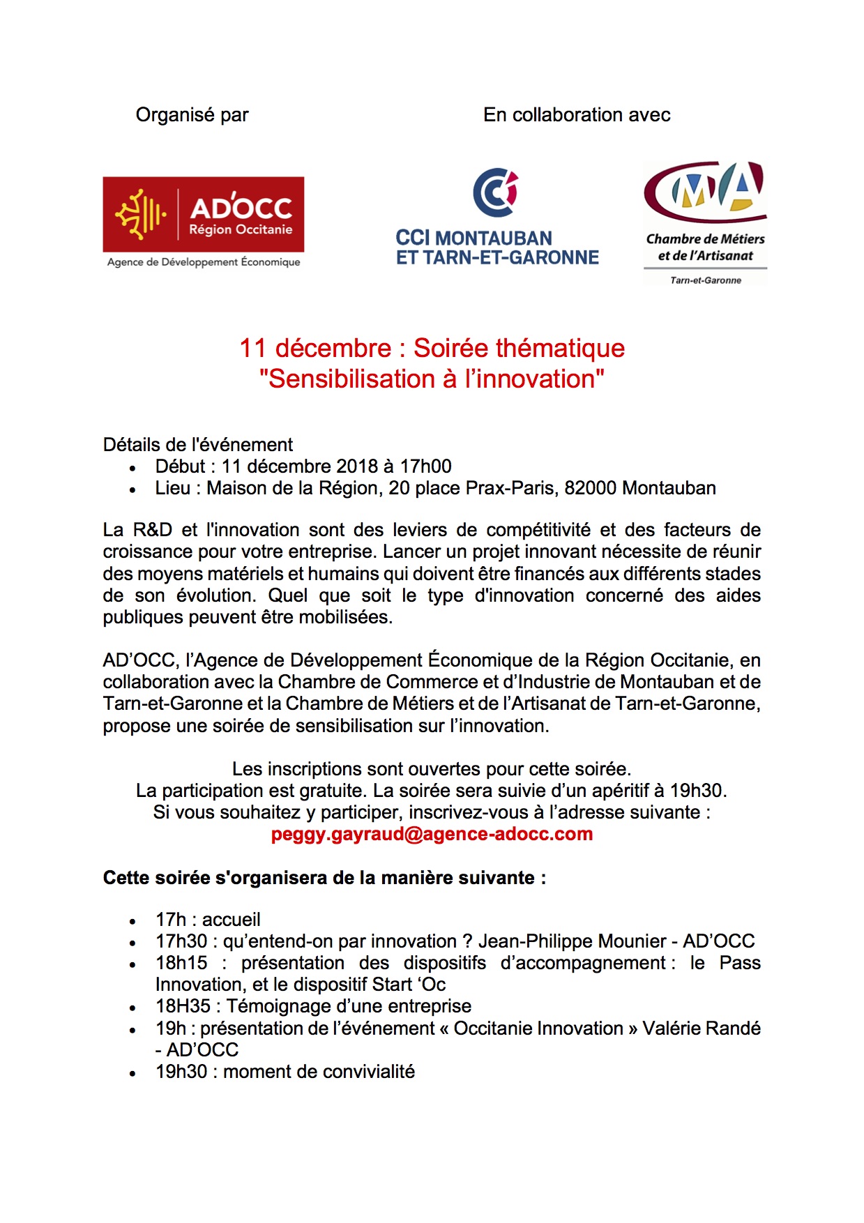 AD’OCC, l’Agence de Développement Économique de la Région Occitanie, en collaboration avec la Chambre de Commerce et d’Industrie de Montauban et de Tarn-et-Garonne et la Chambre de Métiers et de l’Artisanat de Tarn-et-Garonne, propose une soirée de sensibilisation sur l’innovation.