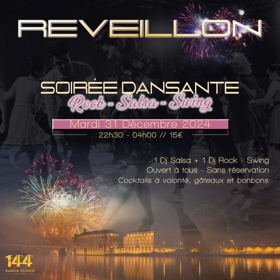 Réveillon essentiellement ROCK, SALSA, SWING avec quelques touches de musiques actuelles sur le coup des minuits et cotillons.