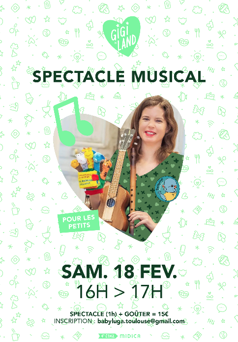 Gigiland, en partenariat avec Babyluga proposent pour les tous petits un spectacle de musique - un véritable moment d’éveil musical suivi d’un goûter !