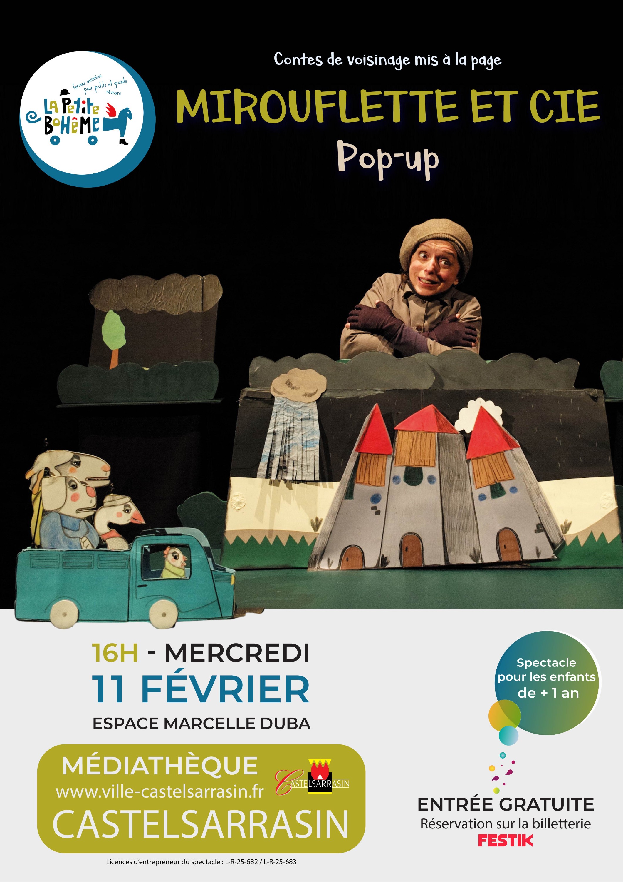 La Compagnie La Petite Bohème présente « Mirouflette et cie », contes de voisinage en théâtre pop-up. Quatre animaux, une petite humaine et un cochon espiègle s’amusent des contes classiques pour nous rassembler avec joie.
