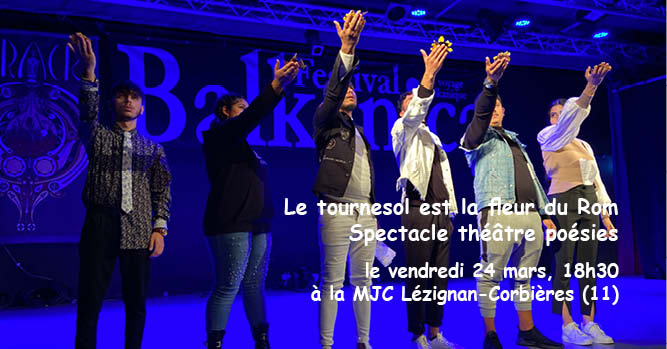 Le vendredi 24 mars, c’est à la MJC de Lézignan-Corbières (11) que les jeunes de l’association Rencont’roms nous présenteront leur spectacle théâtre poésies, "Le tournesol est la fleur du Rom". Une invitation faite par le café poésies dont le thème est une Babel heureuse.