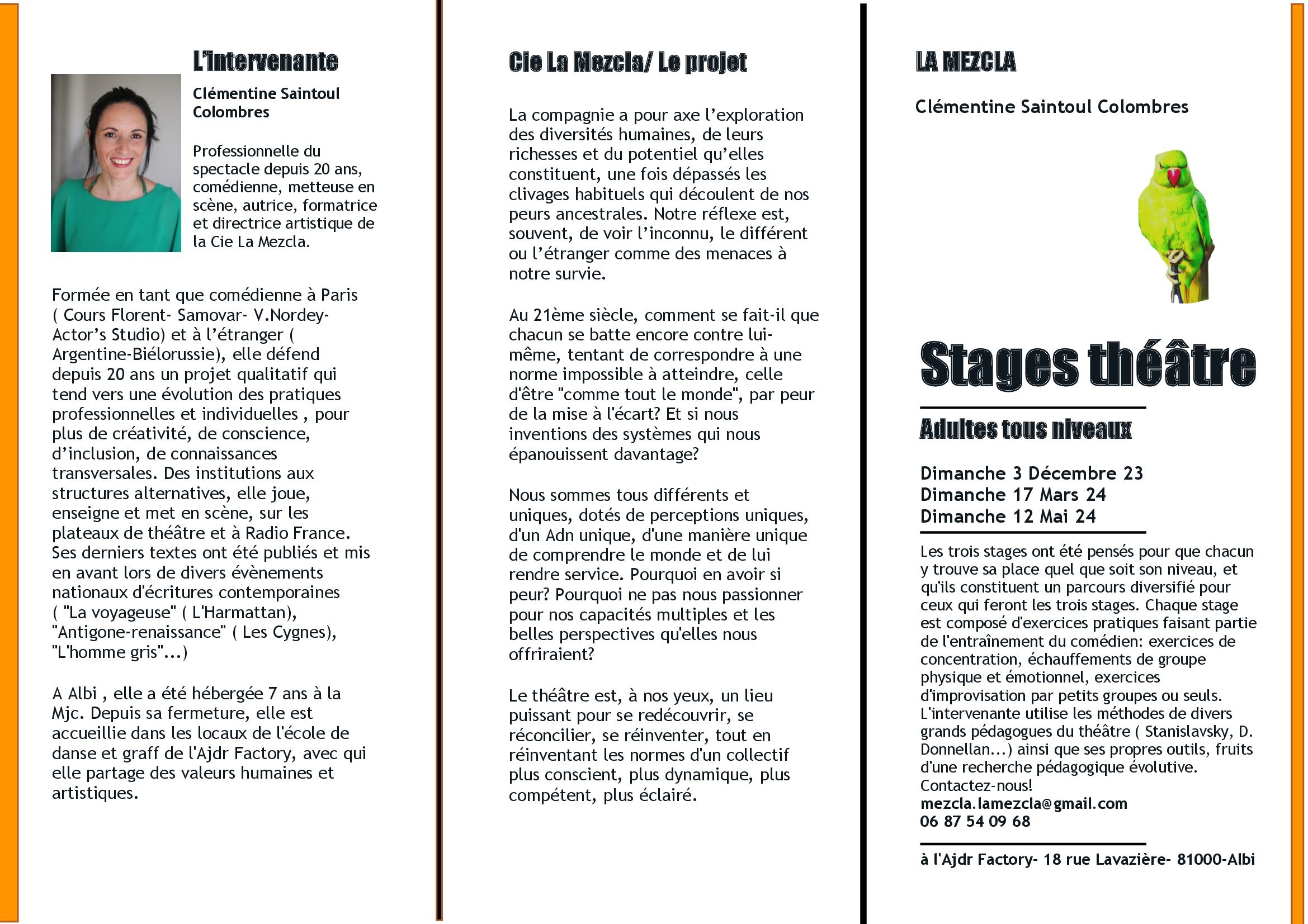 Professionnelle du spectacle depuis 20 ans, comédienne, metteuse en scène, autrice, formatrice et directrice artistique de la Cie La Mezcla. Formée en tant que comédienne à Paris ( Cours Florent- Samovar- V.Nordey-Actor’s Studio) et à l’étranger (Argentine-Biélorussie), elle défend depuis 20 ans un projet qualitatif qui tend vers une évolution des pratiques professionnelles et individuelles , pour plus de créativité, de conscience,