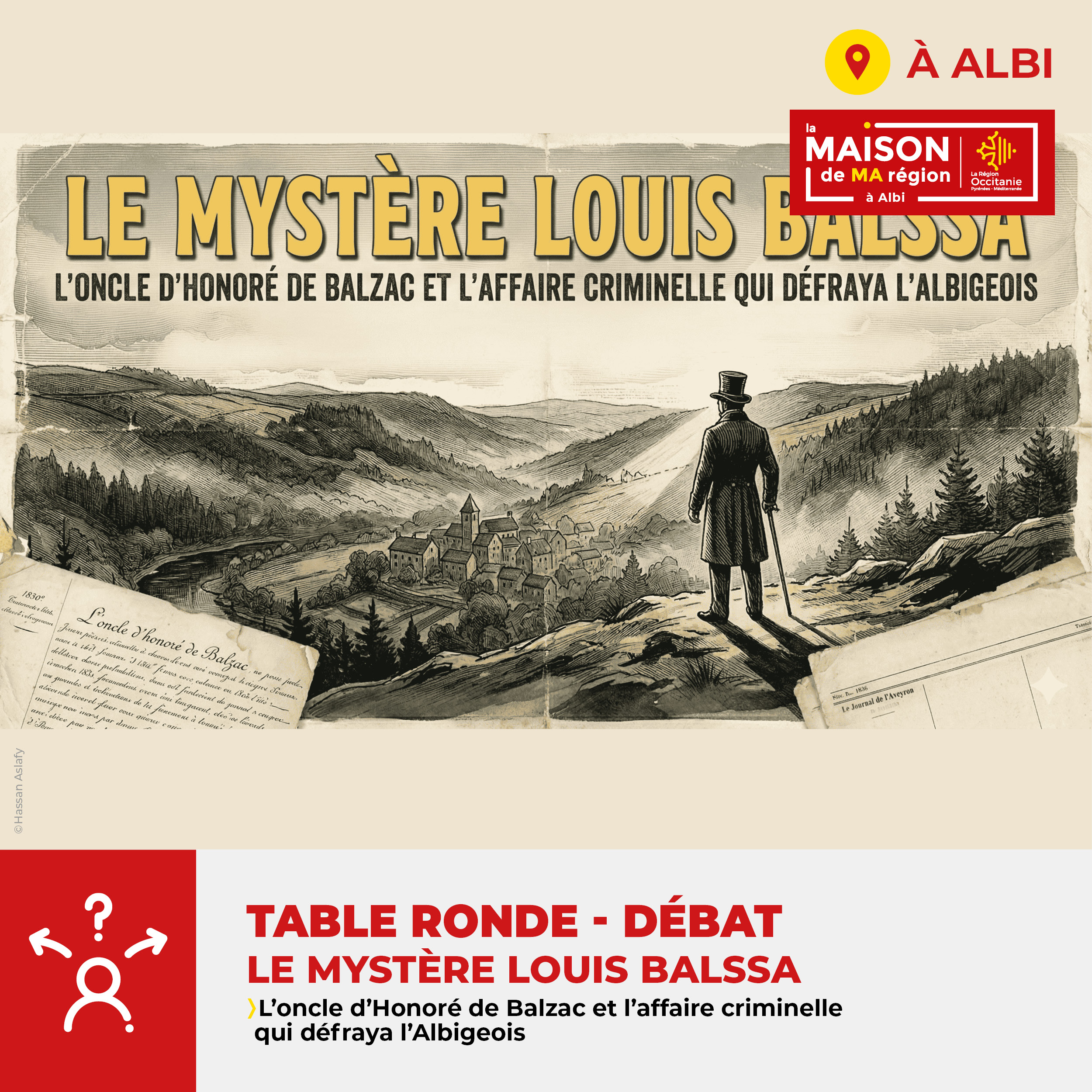 La Maison de Ma Région à Albi organise et vous invite gratuitement à la table ronde - débat "LE MYSTÈRE LOUIS BALSSA : L’oncle d’Honoré de Balzac et l’affaire criminelle qui défraya l’Albigeois" présentée par l’Association du Festival Honoré de Balzac qui aura lieu le jeudi 23 avril 2026 à 18h, nous vous invitons à vous inscrire.