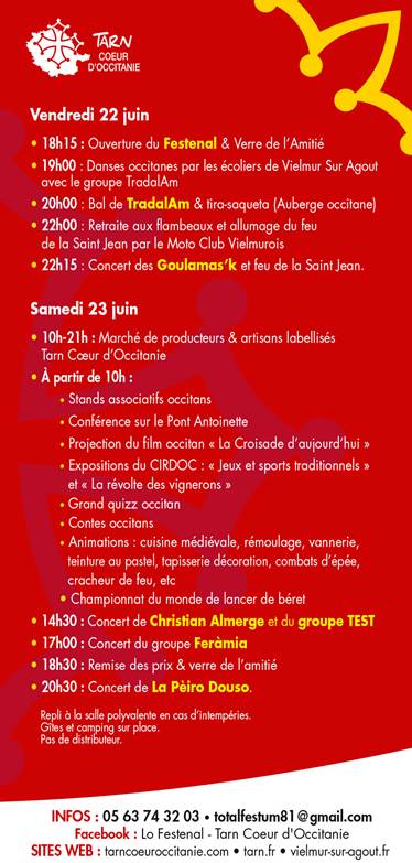 Concerts, danses , marchés de producteurs et d’artisans, jeux anciens géants, feu de la Saint Jean, expositions, visites guidées de Vielmur-sur-Agout, auberges occitanes, conférences, jeux-concours et remises de prix feront partie des animations offertes au grand public lors du 2nd Festival "Tarn cœur d’Occitanie - Lo Festenal " qui se déroulera les vendredi 22 et samedi 23 juin à Vielmur-sur-Agout (Tarn, 81570) selon le programme suivant.