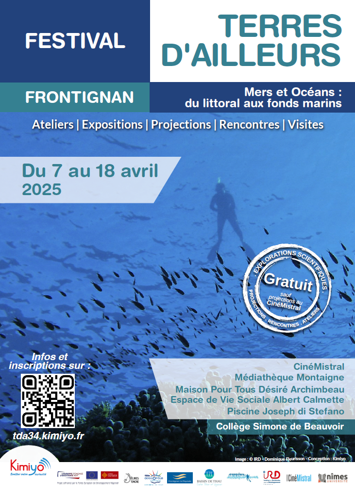 À Frontignan, le Festival Terres d’Ailleurs, est organisé par l’association Kimiyo en collaboration avec la ville de Frontignan et la médiathèque Montaigne du réseau des médiathèques de Sète agglopôle méditerranée. Le festival invite à échanger autour de sujets de société en favorisant le dialogue autour des voyages et des explorations scientifiques. Voguant dans l’ensemble de la région Occitanie/Pyrénées-Méditerranée, il a été créé en 2009 au Muséum d’Histoire Naturelle de Toulouse, par l’Association Délires d’Encre.