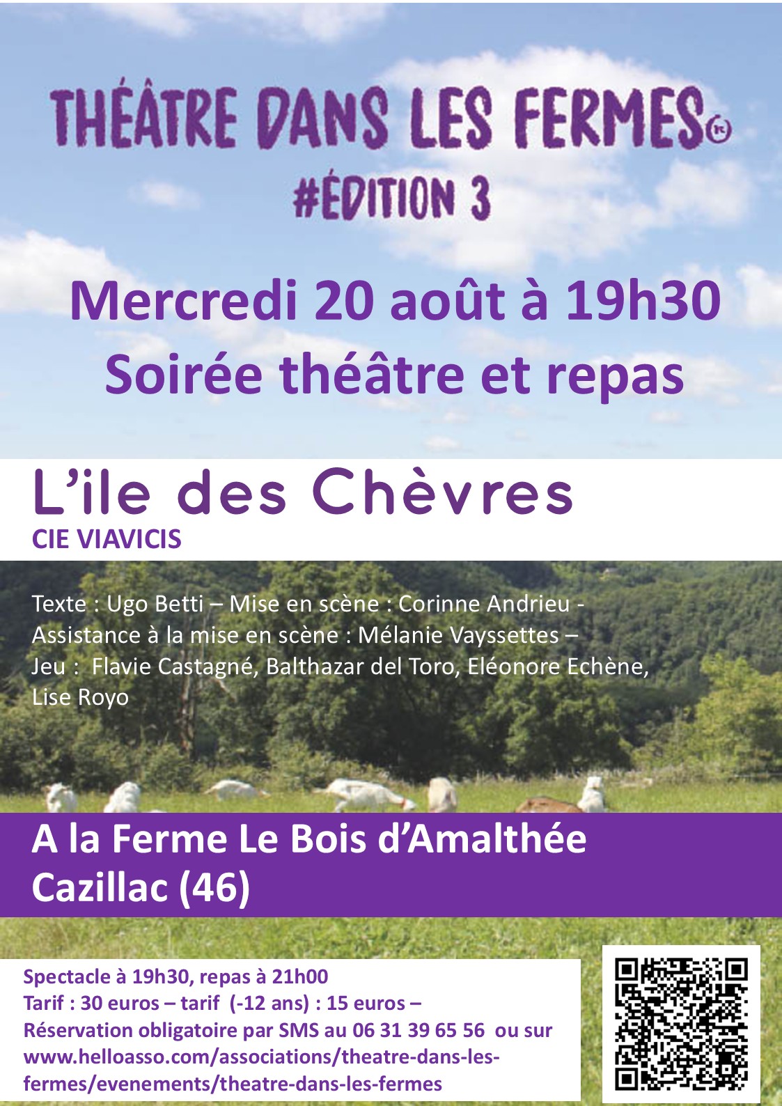 Théâtre dans les fermes est un événement organisé par l’association « Théâtre dans les fermes ». Après le succès de la première édition été 2023 et de la deuxième édition été 2024, l’association a décidé de renouveler la même opération en proposant à 3 compagnies de théâtre de se produire dans 8 fermes différentes. La compagnie Viavicis, à l’origine du projet, présentera son spectacle « l’Ile des Chèvres » dans 4 nouvelles fermes, les 20, 21, 22 et 23 août. Ce sera aussi l’occasion pour la compagnie La Théière de proposer son nouveau spectacle « A travers la chair jusqu’au noyau » pour une soirée le 19 août. Enfin, la compagnie Avec coeur et panache présentera son spectacle « La cuisine des auteurs » les 20, 22 et 28 août. Ces 2 compagnies se produiront dans des fermes déjà partenaires en 2023 et 2024.