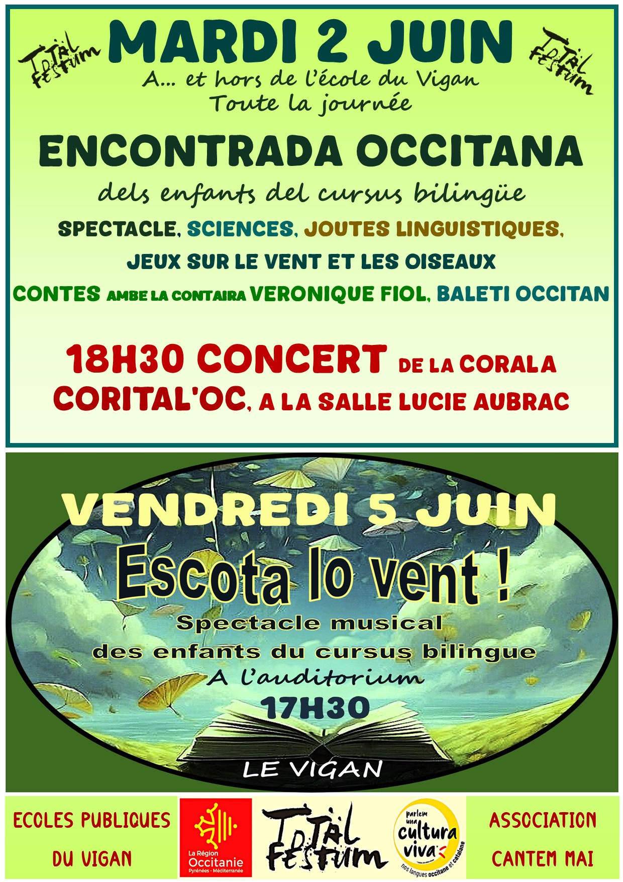 Dimars 2 de junh : tota la jornada, a e fòra de l’escòla, "Encontrada" ambe los enfants del cursus bilingüe, espectacle, sciéncias, ajustas lingüisticas, contes, balèti… De 18h30 a 19h30 : concèrt de la corala Corital’Òc, polifonias occitanas e italianas, sala Lucie Aubrac.